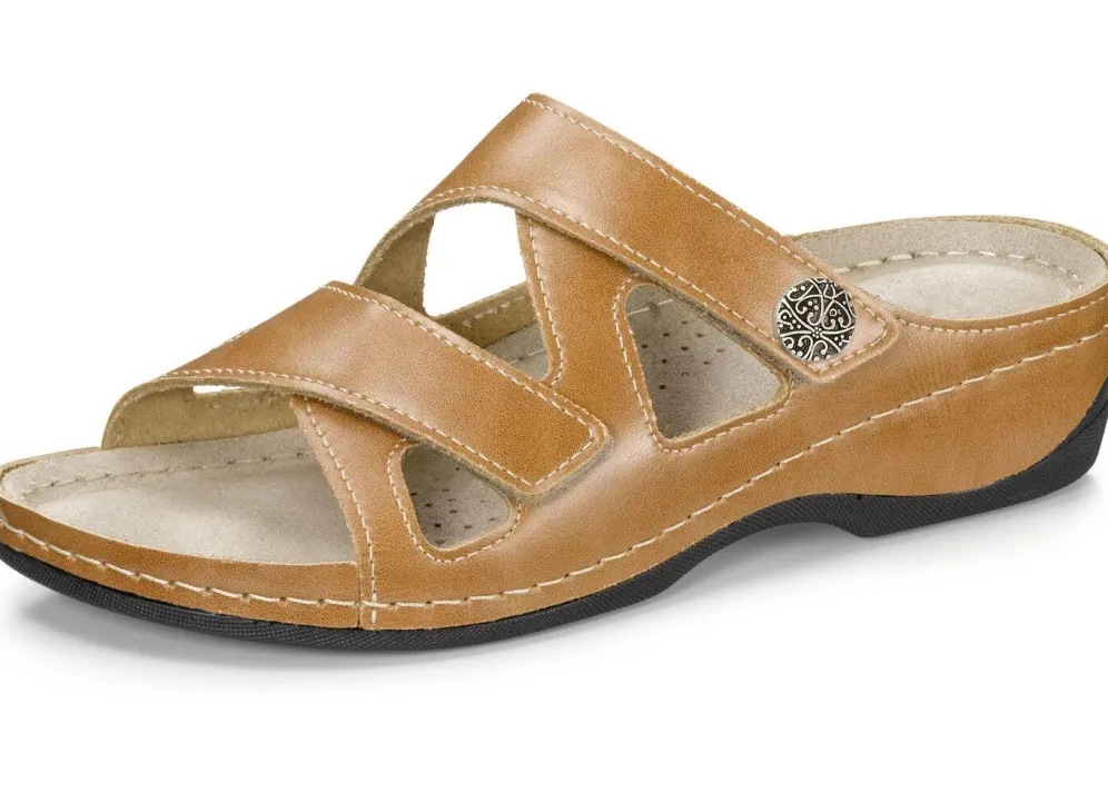 Pantoletten von ELENA EDEN, aus Rind-Nappaleder: in Weite G, zwei verstellbare Klettspangen, gepolstertes Lederfußbett mit Pelotte und Gelenkstütze, leichte PU-Riffelsohle und 30 mm Keilabsatz