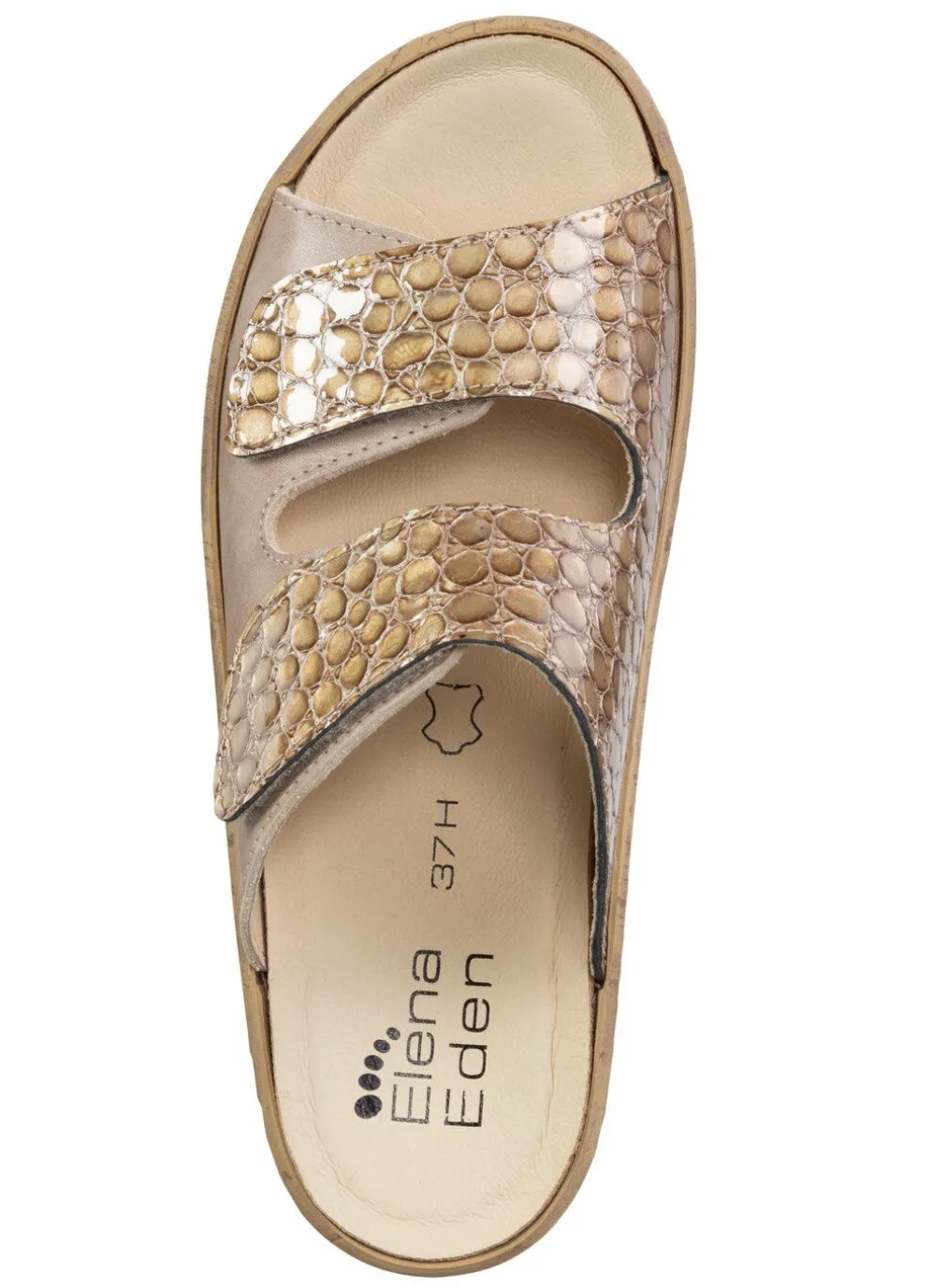 Pantoletten von ELENA EDEN, aus schattiertem Nappa- und krokogeprägtem Lackleder in Taupe: Weite H, zwei Klettspangen, Lederfutter, herausnehmbares Leder-Kork-Fußbett, leichte PU-Laufsohle, 30 mm Keilabsatz in Korkoptik