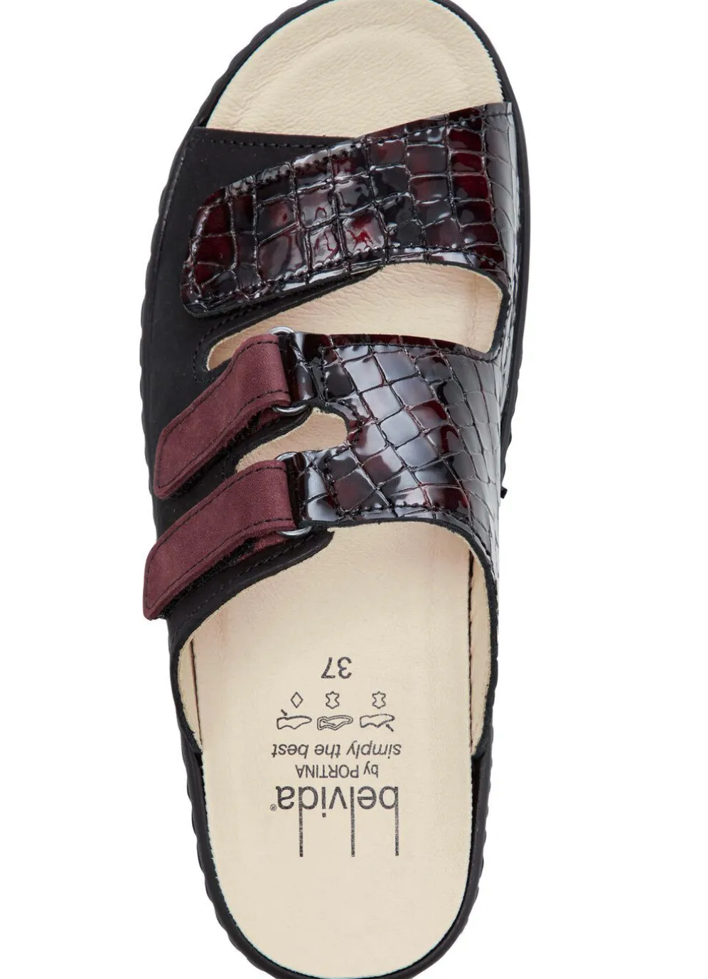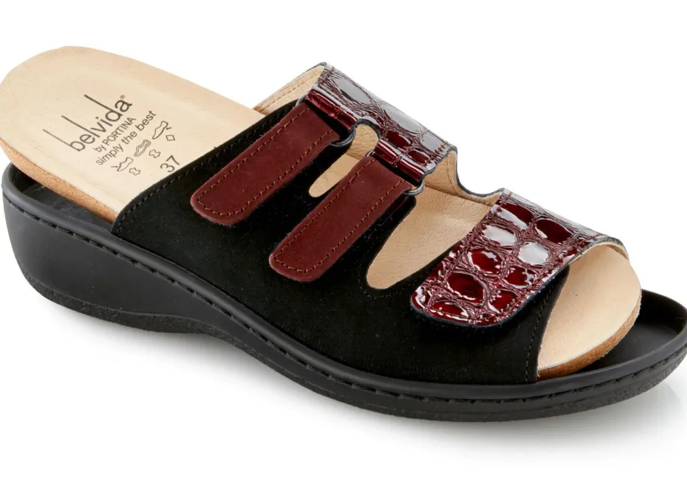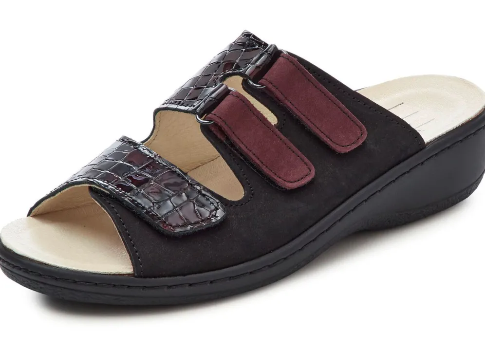 Pantoletten von ELENA EDEN, aus Nubukleder, in Schwarz-Bordeaux mit krokogeprägtem Lackleder kombiniert: Weite H, drei Klettspangen, Lederfutter, herausnehmbares Leder-Kork-Fußbett, leichte PU-Laufsohle sowie 30 mm Keilabsatz