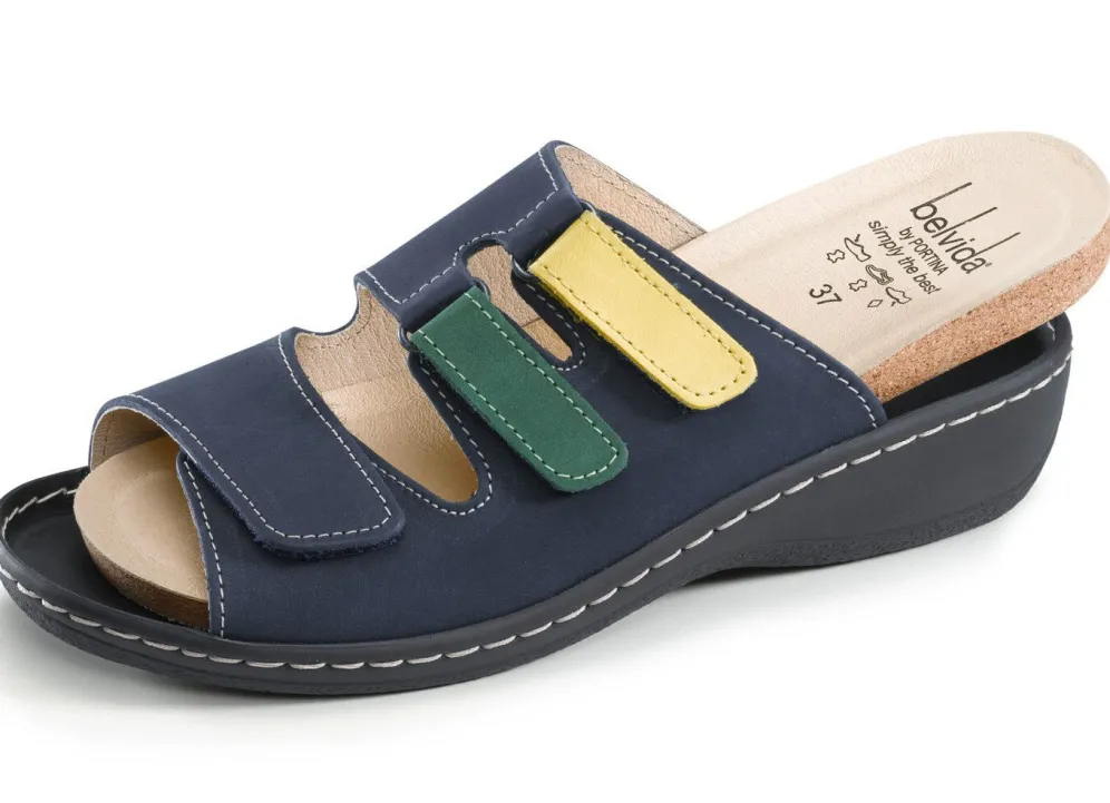 Pantoletten von ELENA EDEN, aus Nubukleder, in Schwarz-Bordeaux mit krokogeprägtem Lackleder kombiniert: Weite H, drei Klettspangen, Lederfutter, herausnehmbares Leder-Kork-Fußbett, leichte PU-Laufsohle sowie 30 mm Keilabsatz