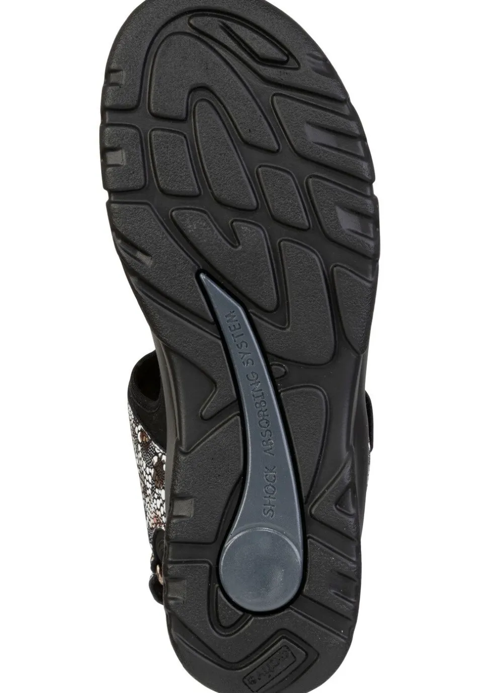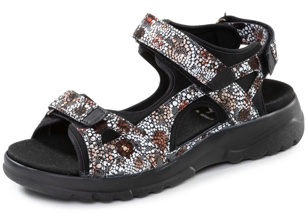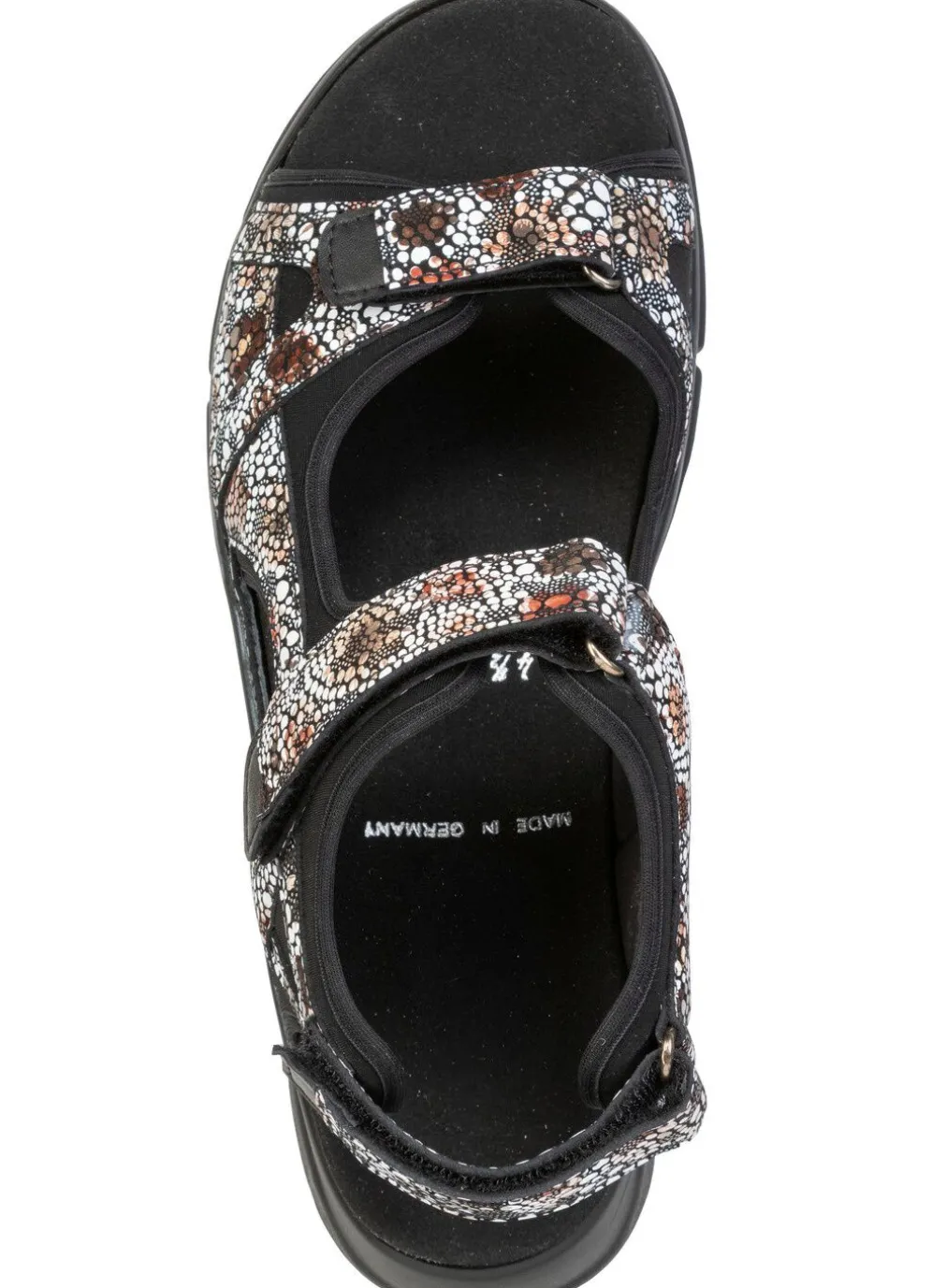 Sandalen von ELENA EDEN aus effektvoll bedrucktem Nappaleder oder weichem Veloursleder und schwarzem Elastikmaterial: Weite H, drei verstellbare Klettspangen, Textilfutter, herausnehmbares Lederfußbett, leichte PU-Luftpolster-Profilsohle sowie 20 mm Keilabsatz