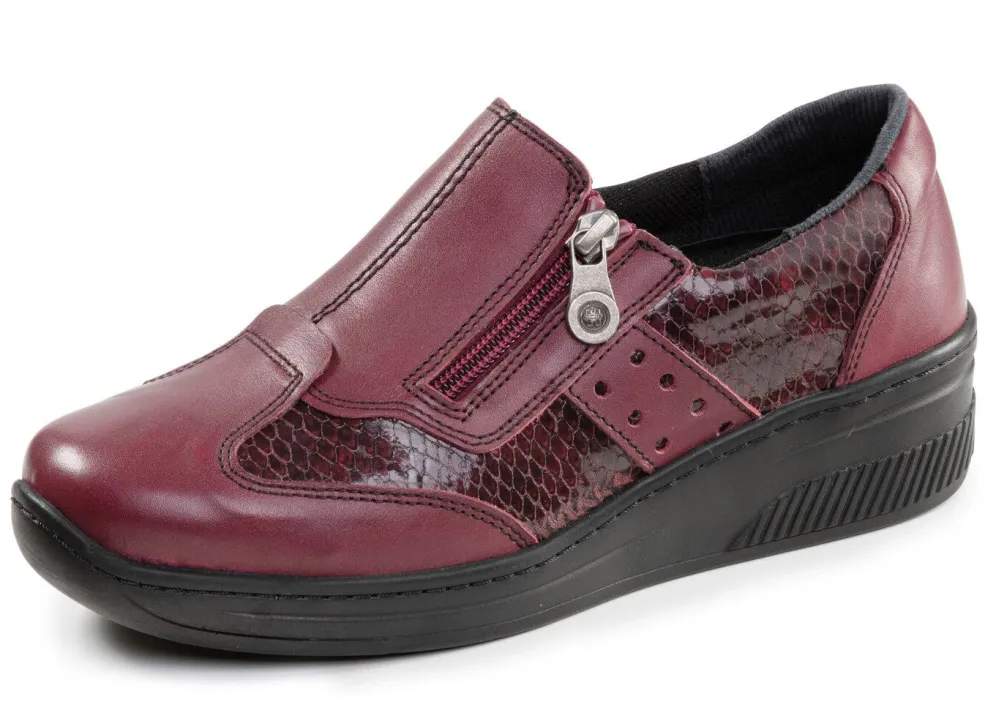 Bequeme Slipper von ELENA EDEN, aus Nappaleder und reptilgeprägtem Lackleder, mit Seitenreißverschluss und Gummizug: Weite H, Textilfutter, herausnehmbares Lederfußbett, leichte PU-Laufsohle sowie 25 mm Keilabsatz