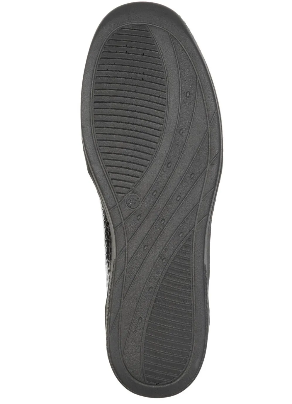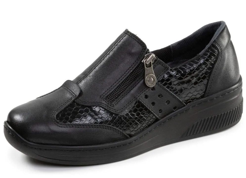 Bequeme Slipper von ELENA EDEN, aus Nappaleder und reptilgeprägtem Lackleder, mit Seitenreißverschluss und Gummizug: Weite H, Textilfutter, herausnehmbares Lederfußbett, leichte PU-Laufsohle sowie 25 mm Keilabsatz