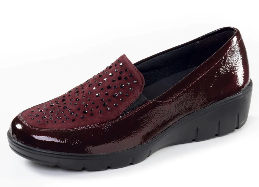 Slipper von ELENA EDEN, aus Lack- und Veloursleder, teilweise mit schwarzen Glitzersteinchen verziert: Weite H, seitlich eingesetzte Gummizüge, ledergefüttertes Quartier, herausnehmbares Lederfußbett, leichte PU-Luftpolster-Profilsohle sowie 25 mm Keilabsatz