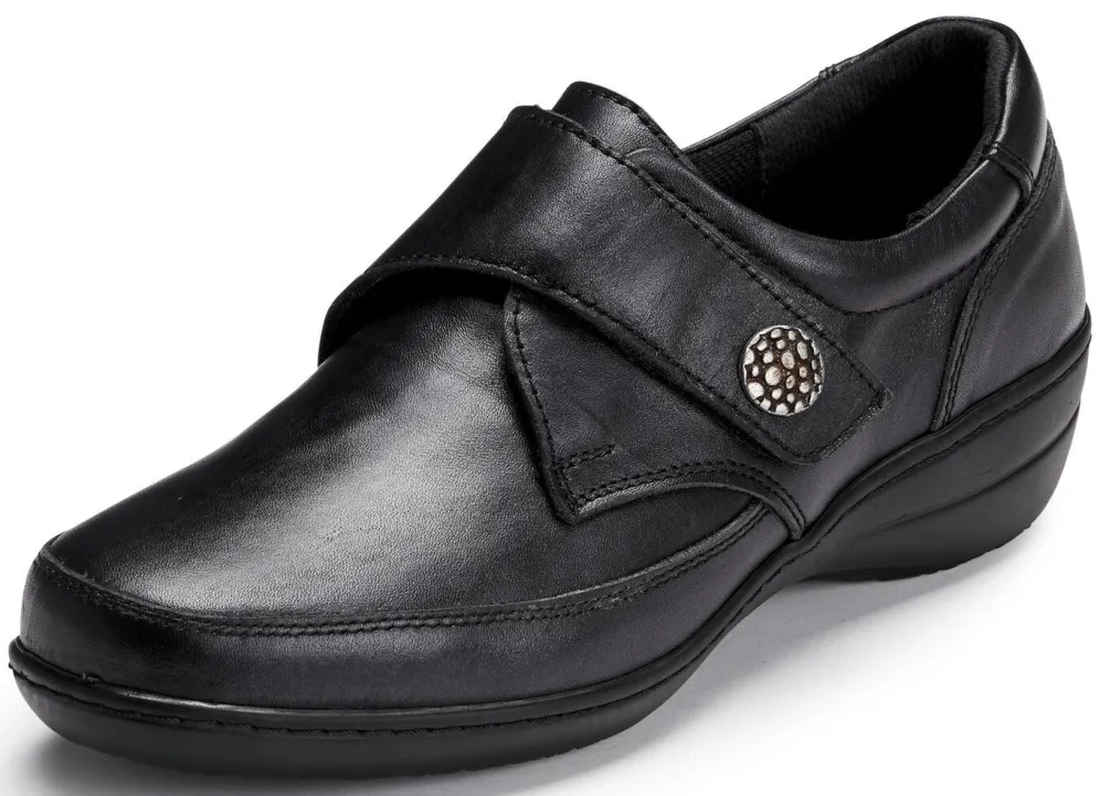 Slipper von ELENA EDEN, aus Nappaleder: in Weite H, verstellbare Klettspange mit Metallschmuck, Textilfutter, herausnehmbares Lederfußbett, leichte PU-Laufsohle, 30 mm Keilabsatz
