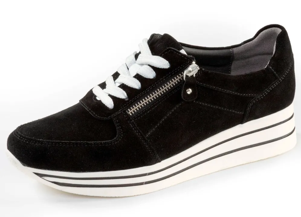 Schwarze Sneaker von ELENA EDEN, aus Veloursleder mit Schnürung und seitlichem Reißverschluss: Weite G, Futter, herausnehmbares Fußbett, leichte TR-Laufsohle mit Plateau sowie 15 mm Keilabsatz