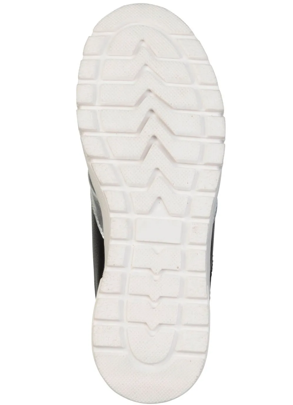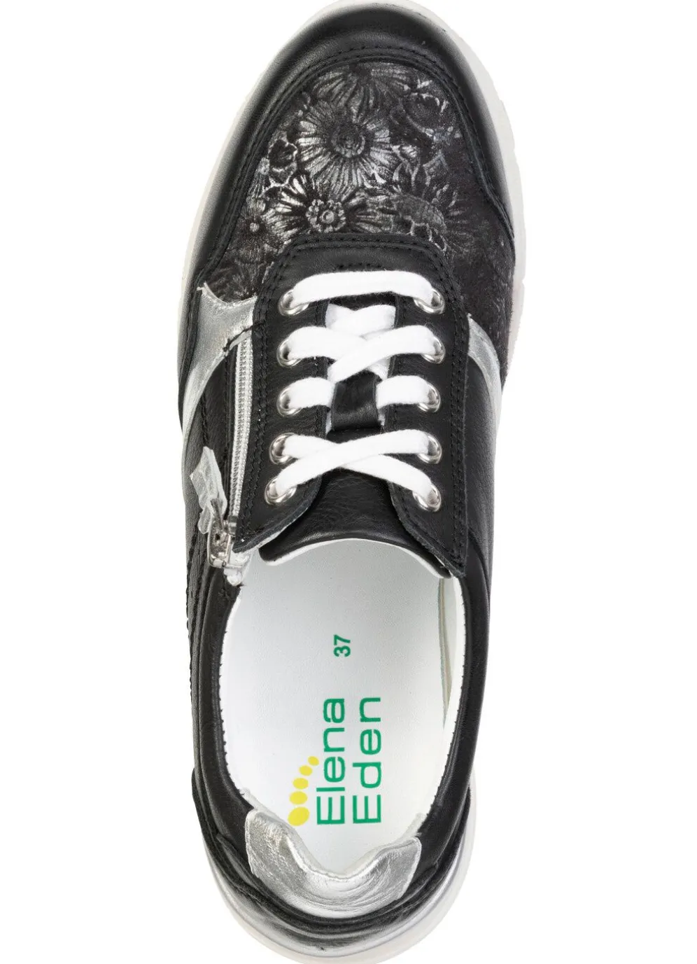Sneaker von ELENA EDEN aus Nappaleder und schimmernd geprägtem Elastikmaterial, mit silberfarbenen Besätzen: Weite H, Schnürung, Seitenreißverschluss, Futter und herausnehmbares Fußbett aus Leder, leichte TPR-Profilsohle sowie 30 mm Keilabsatz