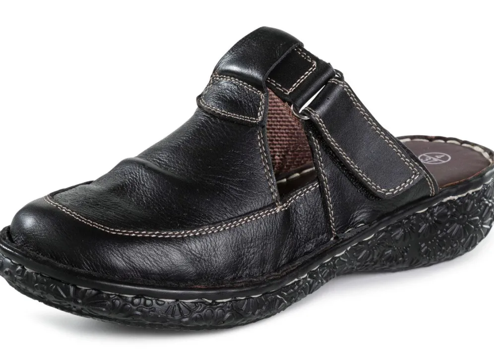 ELENA EDEN-Clog aus genarbtem Nappaleder: in Weite G, Zierlochung, Klettspange, Textilfutter, gepolsertes Lederfußbett, leichte PU-Laufsohle sowie 20 mm Keilabsatz