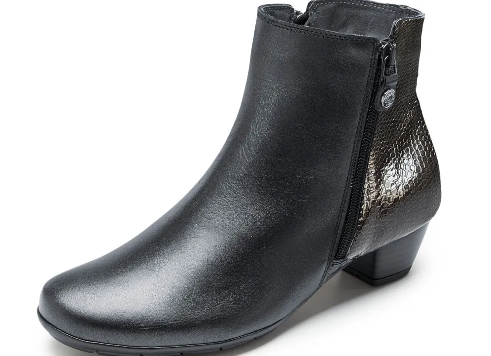 Stiefeletten von ELENA EDEN, aus Nappaleder und glänzend geprägtem Leder: in Weite G, zwei seitliche Reißverschlüsse, Textilfutter, herausnehmbares Fußbett, leichte TR-Profilsohle sowie 35 mm Absatz. Schafthöhe ca. 12 cm