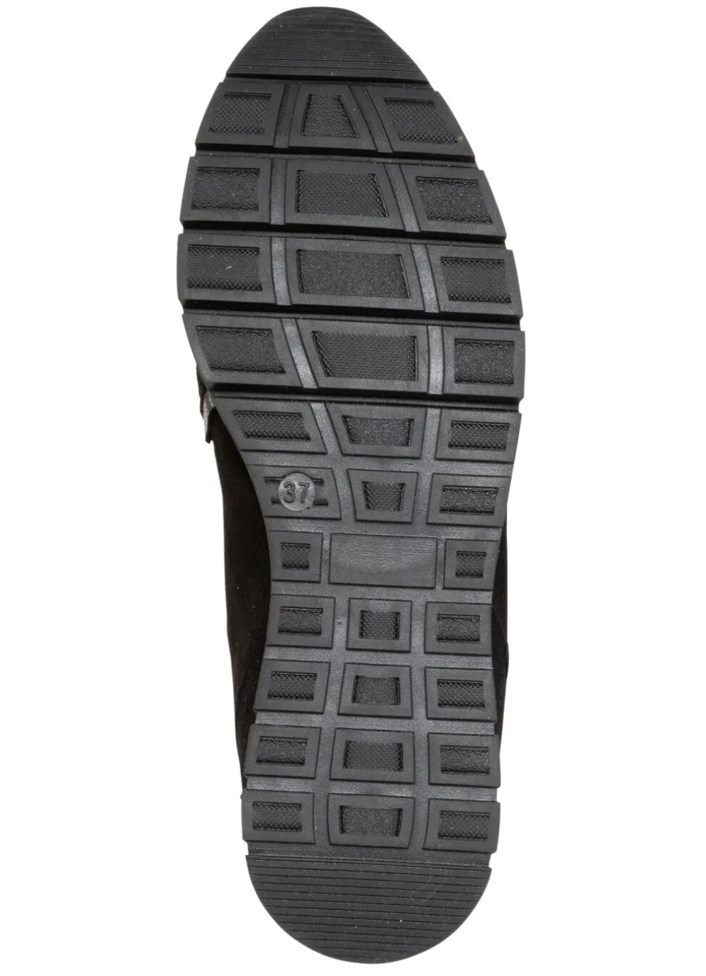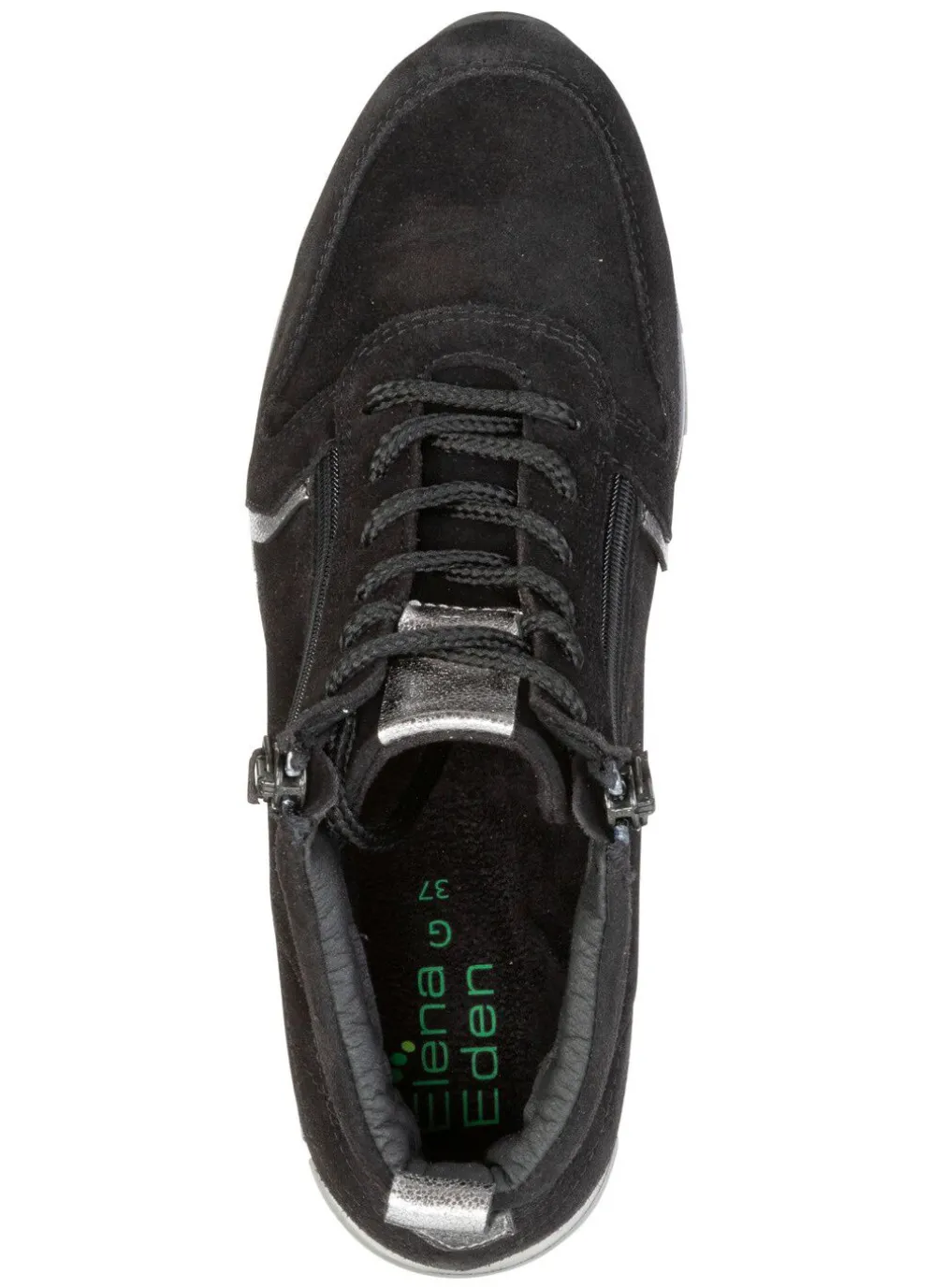 Boots von ELENA EDEN, aus Veloursleder, mit glänzend geprägten Besätzen: Weite G, Schnürung, zwei seitlich eingesetzte Reißverschlüsse, wärmendes Textilfutter, herausnehmbares Fußbett, leichte TR-Laufsohle sowie 15 mm Keilabsatz. Schafthöhe ca. 11 cm