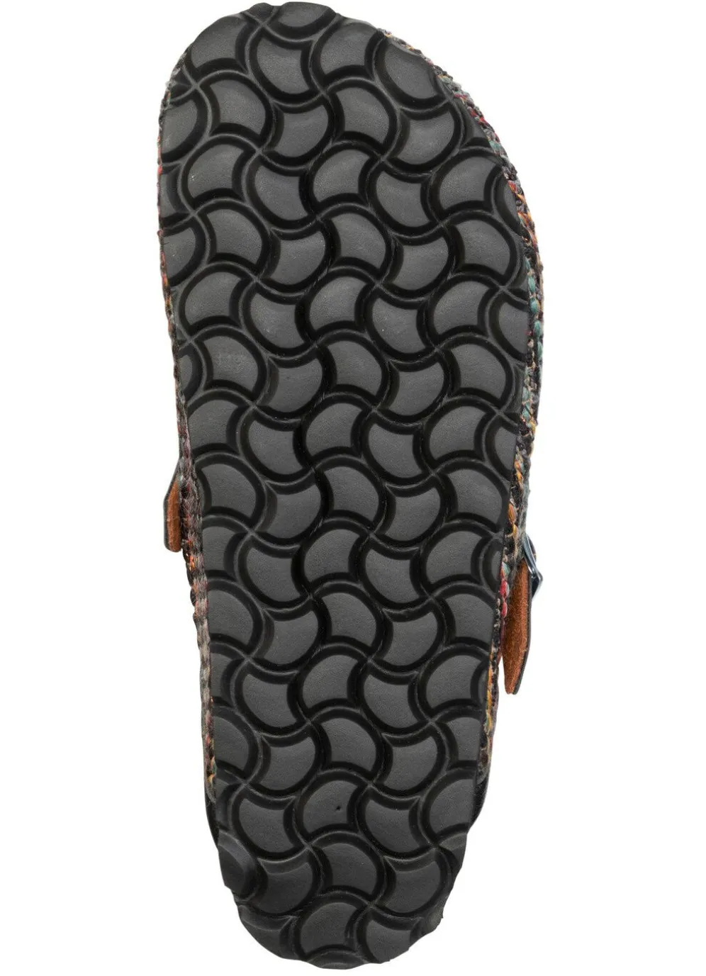 Clogs von ELENA EDEN in Schwarz-Multicolor aus grob gewebtem Textilmaterial, mit verstellbarer Spange: Weite H, Textilfutter, gepolstertes Lederfußbett, leichte EVA-Profilsohle sowie 10 mm Keilabsatz