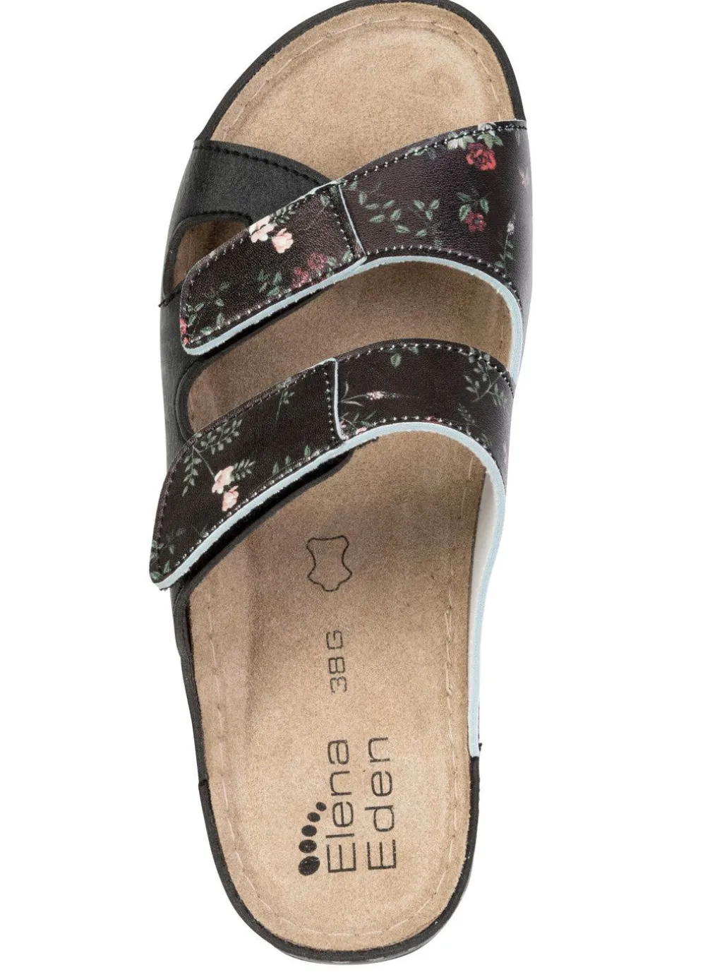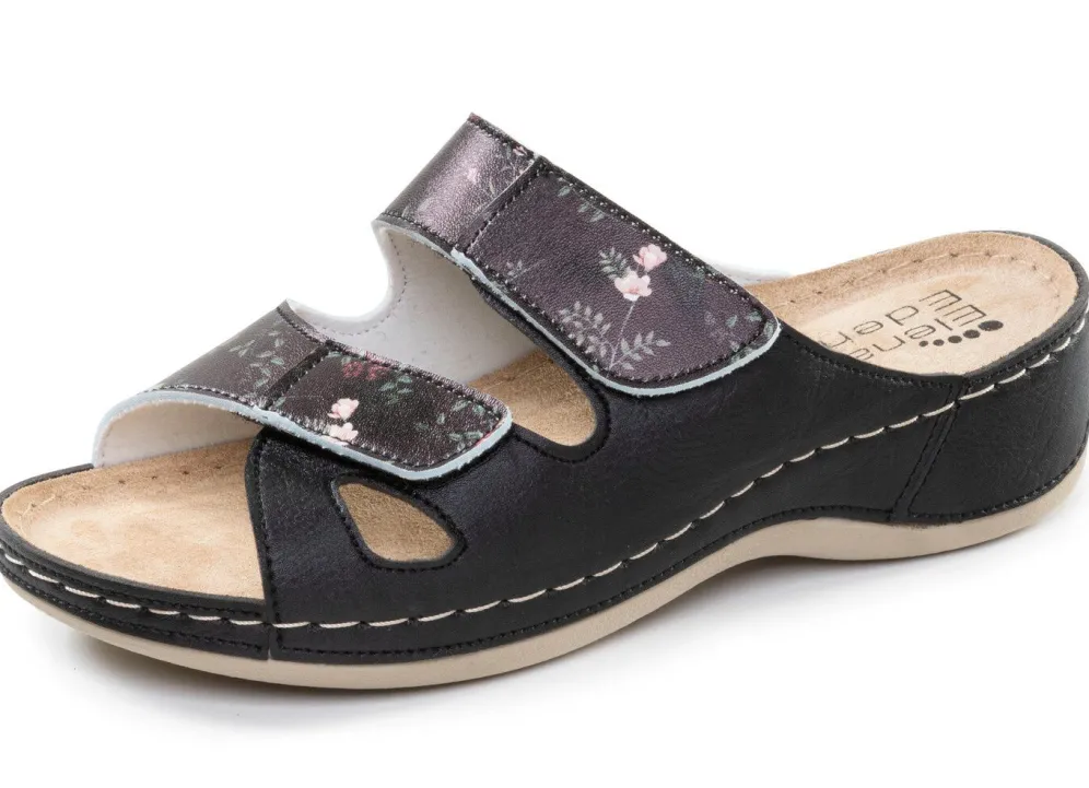 Pantoletten von ELENA EDEN aus teils floral bedrucktem Synthetikmaterial mit zwei verstellbaren Klettspangen: Weite G, Textilfutter, gepolstertes Lederfußbett, leichte PU-Laufsohle sowie 25 mm Keilabsatz
