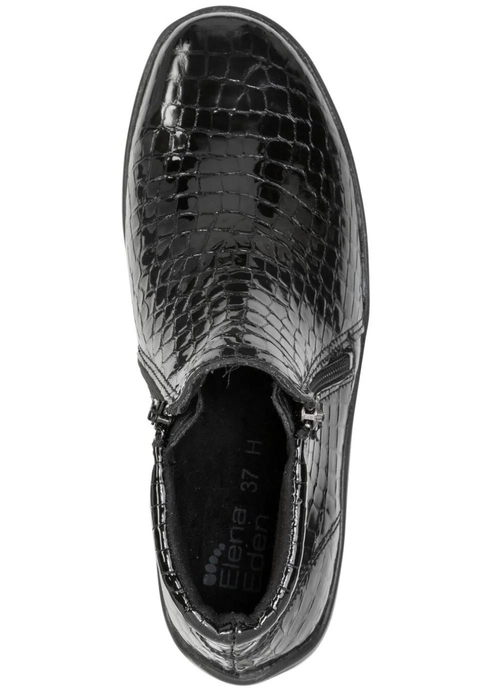 Stiefeletten von ELENA EDEN, aus edlem, krokogeprägtem Lackleder, mit zwei Seitenreißverschlüssen: Weite H, Textilfutter, herausnehmbares Fußbett, superleichte PU-Profilsohle sowie 15 mm Keilabsatz. Schafthöhe ca 9 cm