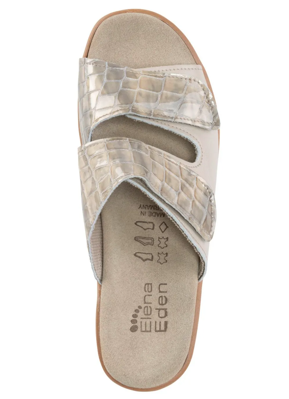 ELENA EDEN-Pantolette aus krokogeprägtem, teilweise schattiertem Lackleder, sowie Nappaleder: Weite H, zwei Klettspangen, Futter, gepolstertes Lederfußbett, leichte EVA-Riffelsohle, 25 mm Keilabsatz mit Korkeinlage