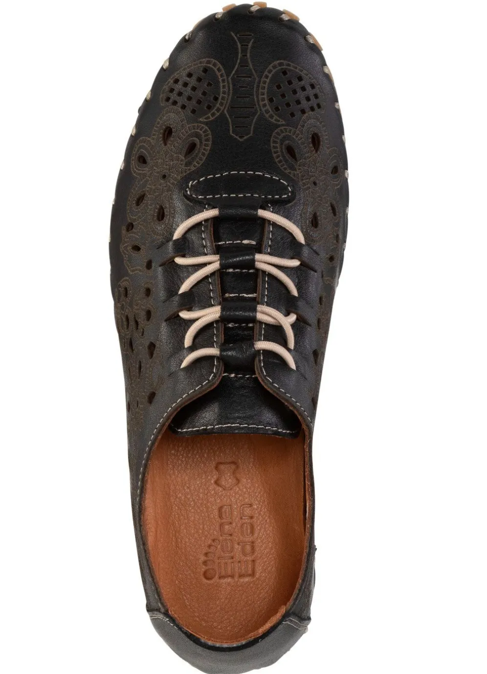 Luftig perforierter Slipper von ELENA EDEN, aus weichem Nappaleder mit Prägung: Elastik-Schnürung, Lederfutter, gepolsterte Lederdecksohle, superleichte TPU-Noppensohle sowie 10 mm Keilabsatz