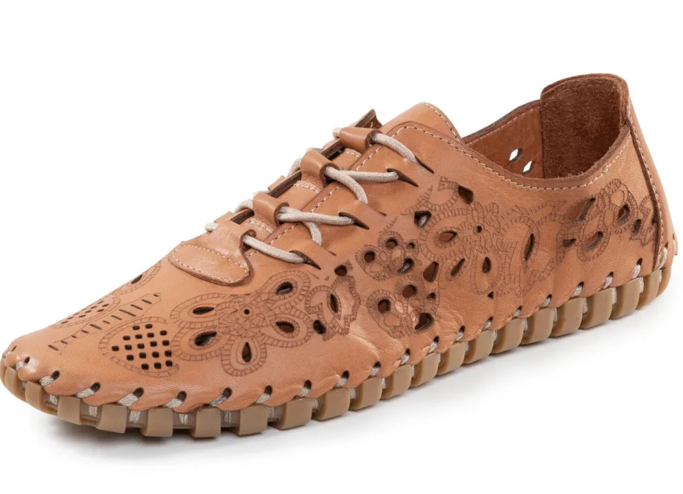 Luftig perforierter Slipper von ELENA EDEN, aus weichem Nappaleder mit Prägung: Elastik-Schnürung, Lederfutter, gepolsterte Lederdecksohle, superleichte TPU-Noppensohle sowie 10 mm Keilabsatz