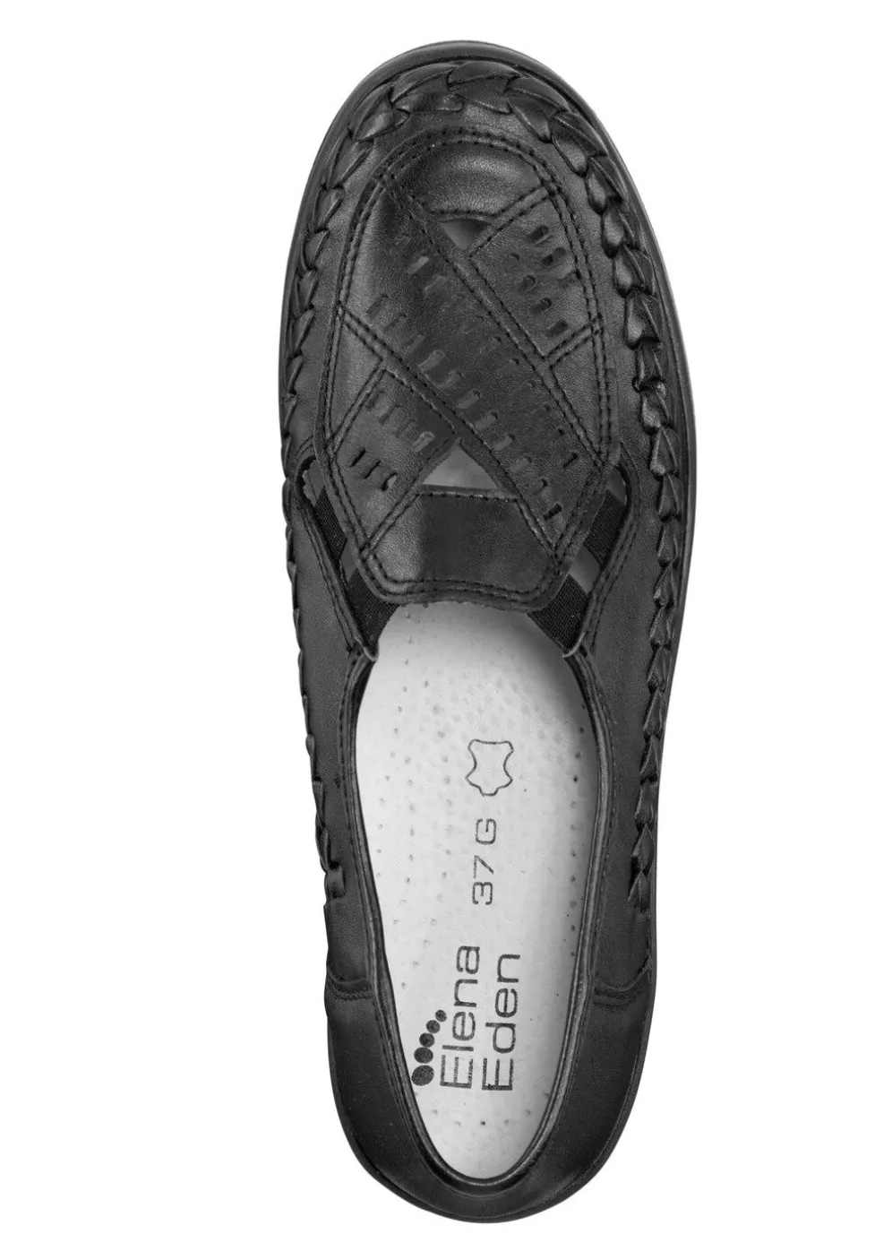 Luftig durchbrochener ELENA EDEN-Slipper aus Nappaleder, mit Flechtdurchzug: Weite G, seitliche Gummizüge, Futter, herausnehmbares Lederfußbett, leichte PU-Laufsohle sowie 20 mm Keilabsatz