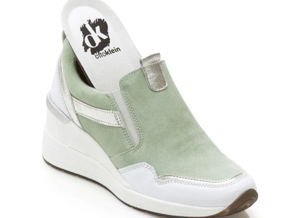Slipper von ELENA EDEN, aus Rind-Veloursleder sowie Nappaleder in Weiß und Silber, mit seitlich eingesetzten Gummizügen: in Weite H, Textilfutter, herausnehmbares Fußbett, leichte TR-Laufsohle sowie 50 mm Keilabsatz