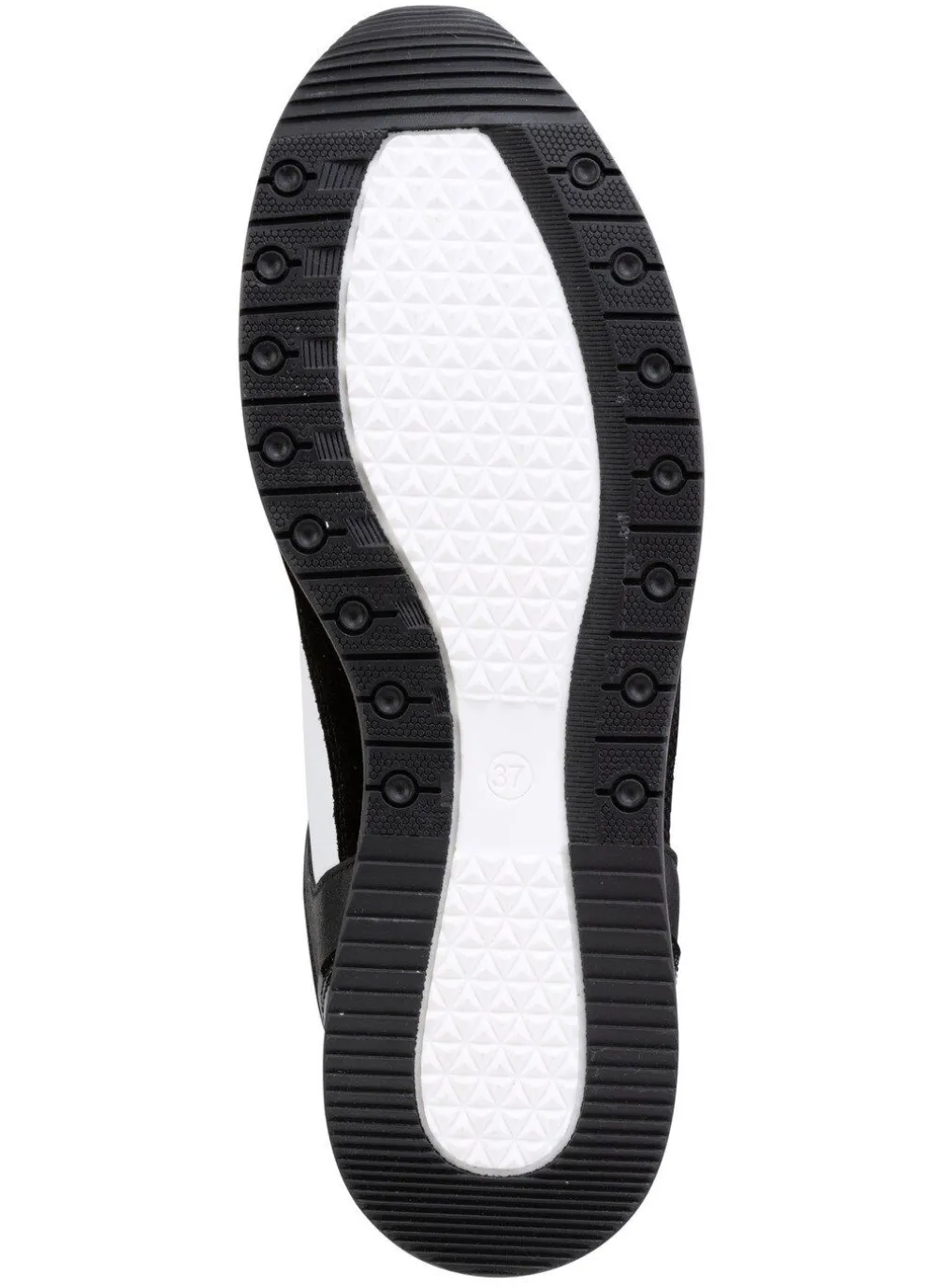 ELENA EDEN-Sneaker in Schwarz-Weiß aus Nappa- und Veloursleder, kombiniert mit glitzerndem Lack: Weite G, Schnürung, gepolstertes Frottee-Futter, herausnehmbares Fußbett, leichte TR-Laufsohle sowie 15 mm Keilabsatz