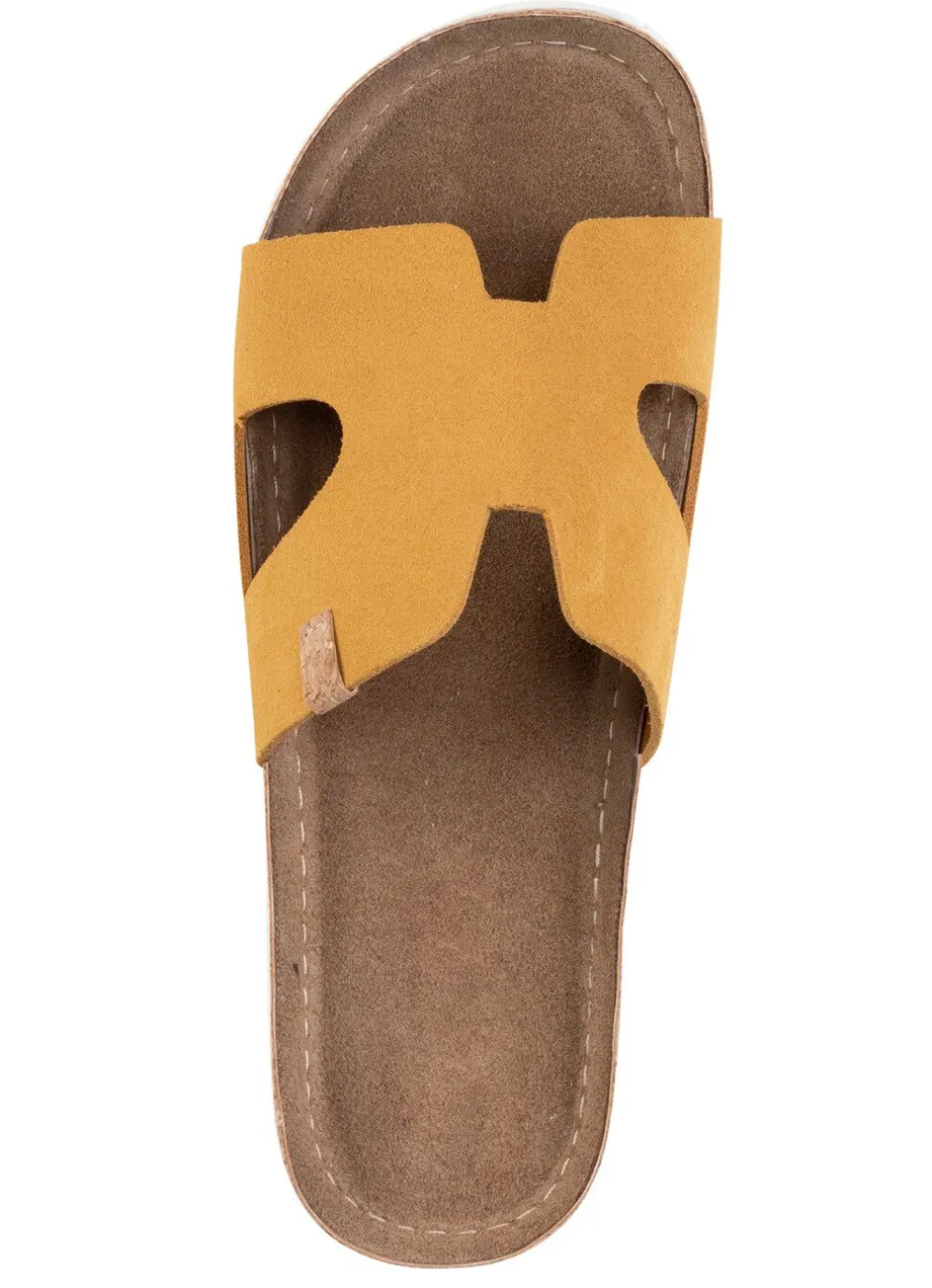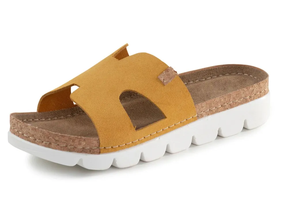 Pantoletten von ELENA EDEN aus Veloursleder: gepolstertes Lederfußbett mit korkbezogenem Rahmen, leichte PU-Profilsohle, 10 mm Keilabsatz
