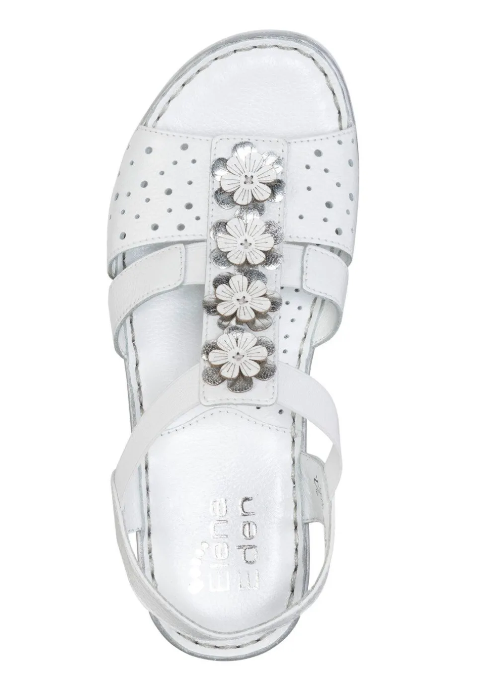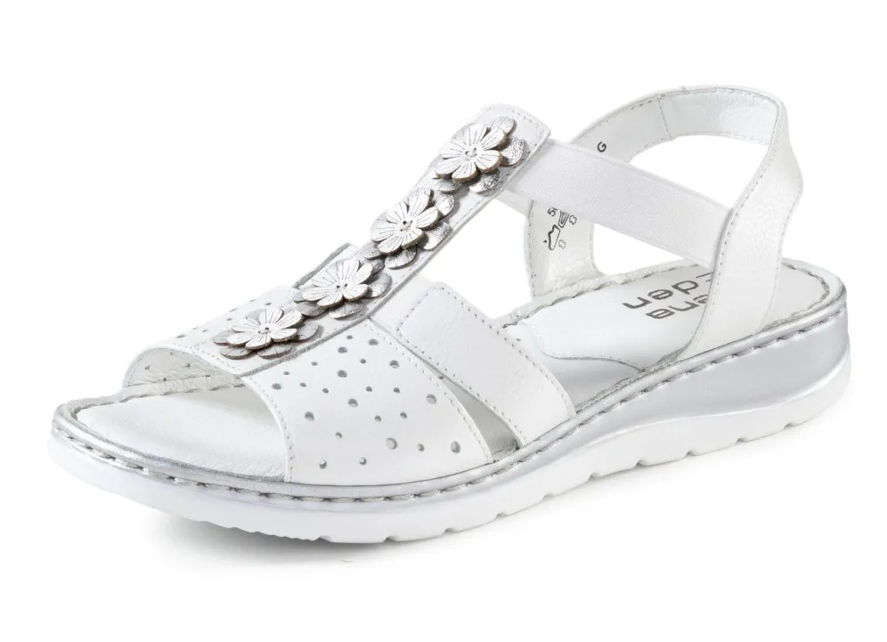 Sandalen von ELENA EDEN aus genarbtem Nappaleder mit luftiger Lochung und niedlichen Lederblüten: Weite G, seitliche Elastik-Bandagen, Lederfutter, weich gepolsterte Lederdecksohle, leichte PU-Riffelsohle sowie 15 mm Keilabsatz