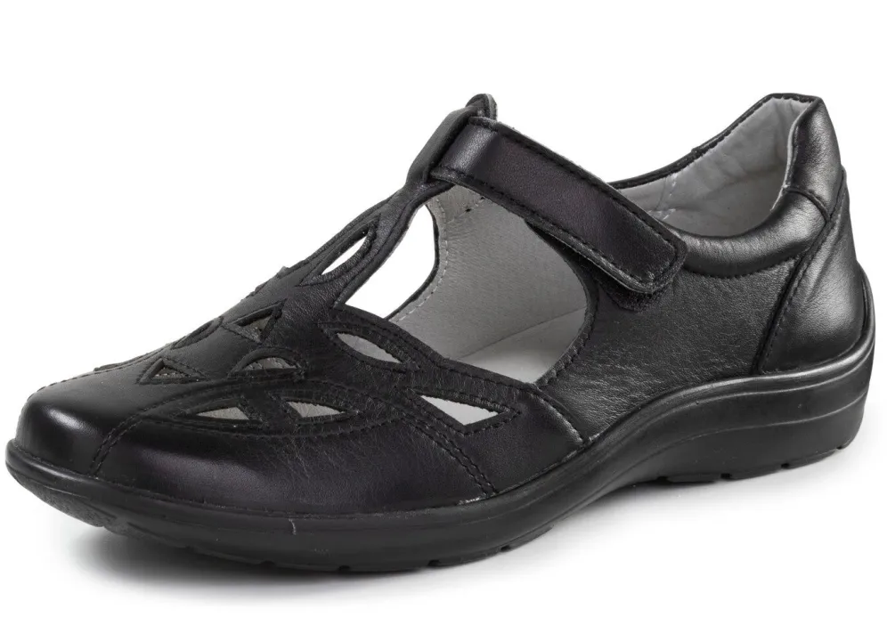 Luftig durchbrochene Slipper von ELENA EDEN aus teilweise schimmerndem Nappaleder: Weite H, verstellbare Klettspange, Futter, herausnehmbares Lederfußbett, leichte PU-Laufsohle sowie 15 mm Keilabsatz