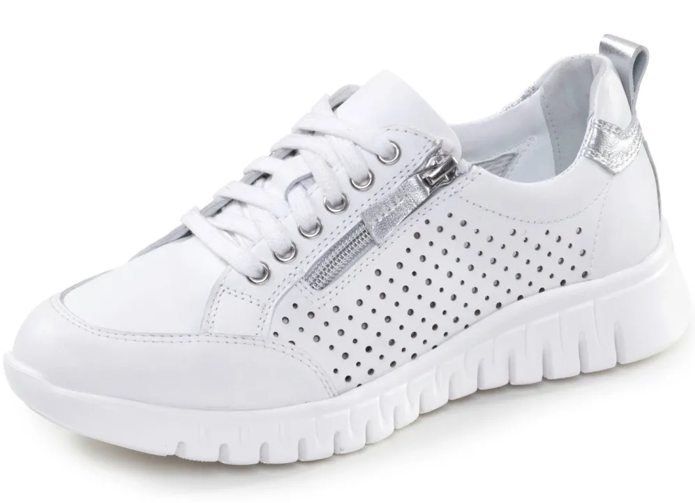 Luftig perforierte Sneaker von ELENA EDEN aus Nappa- oder Veloursleder: Weite H, Schnürung, seitlicher Reißverschluss, ledergefüttertes Quartier, herausnehmbares Lederfußbett, superleichte Synthetik-Laufsohle sowie 20 mm Keilabsatz
