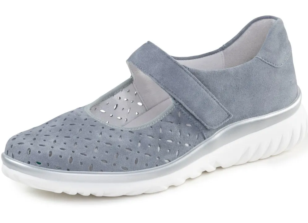 Hochwertiger Spangenschuh von ELENA EDEN, aus Veloursleder mit luftigen Durchbrüchen: Weite H, Klettverschluss, Lederfutter, herausnehmbares Lederfußbett, leichte PU-Luftpolster-Profilsohle sowie 20 mm Keilabsatz
