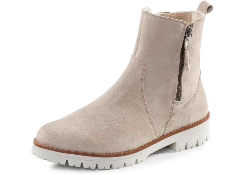 Stiefelette von ELENA EDEN aus Veloursleder, in Schwarz aus genarbtem Nappaleder, mit zwei praktischen Seitenreißverschlüssen: Weite G, wärmendes Textilfutter, herausnehmbares Fußbett, leichte PU-Profilsohle sowie 15 mm Absatz. Schafthöhe ca. 13 cm