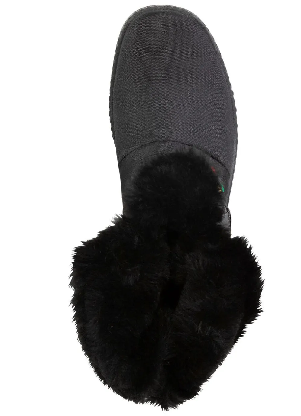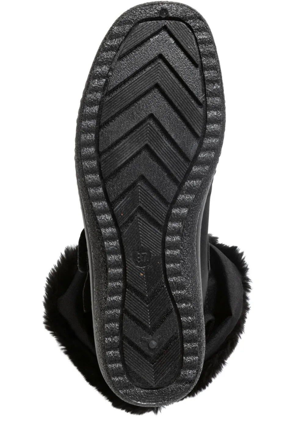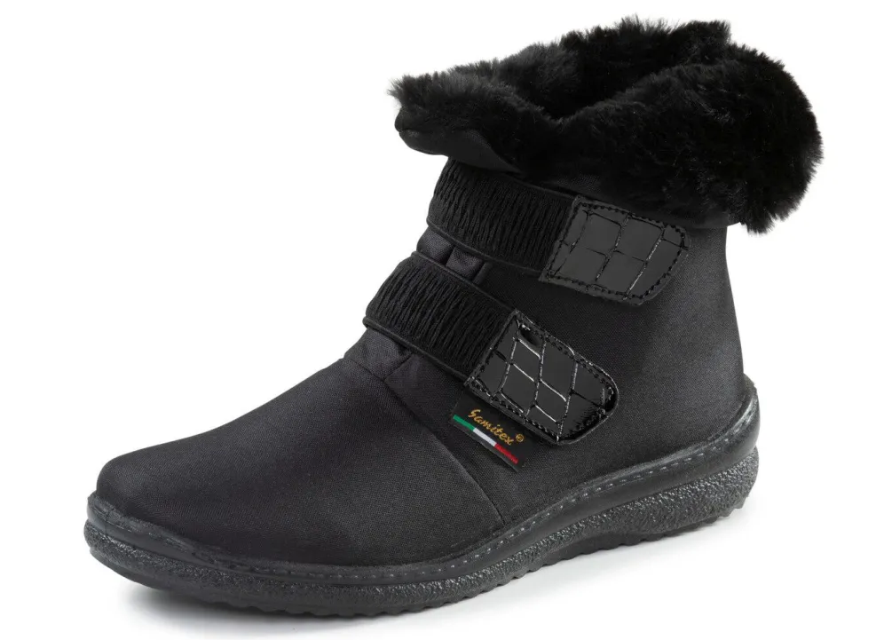 Wetterfeste ELENA EDEN-Stiefelette aus weichem Textilmaterial, mit Klimamembrane ausgestattet: Weite G, zwei elastische Klettspangen mit geprägtem Lackbesatz, umschlagbarer Kragen, Warmfutter aus 100% Polyester, PVC-Profilsohle sowie 20 mm Keilabsatz. Schafthöhe ca. 12-17 cm
