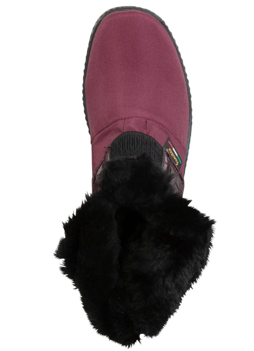 Wetterfeste ELENA EDEN-Stiefelette aus weichem Textilmaterial, mit Klimamembrane ausgestattet: Weite G, zwei elastische Klettspangen mit geprägtem Lackbesatz, umschlagbarer Kragen, Warmfutter aus 100% Polyester, PVC-Profilsohle sowie 20 mm Keilabsatz. Schafthöhe ca. 12-17 cm
