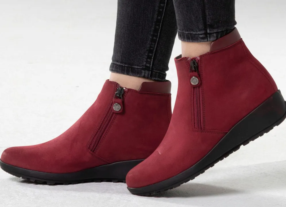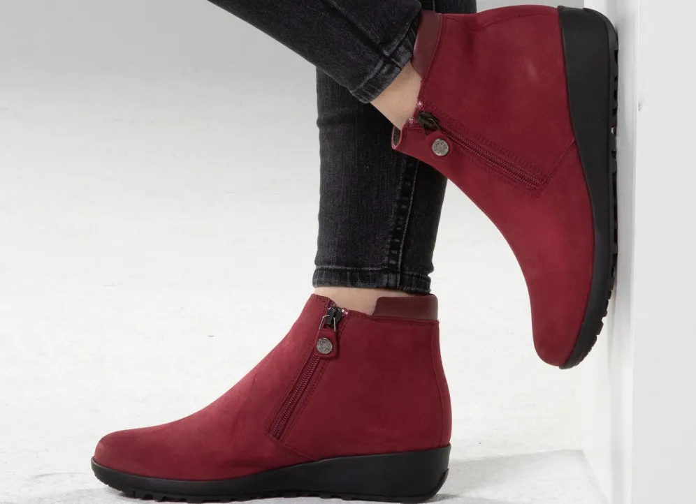 ELENA EDEN-Stiefelette aus Nubukleder mit Nappaleder-Besatz: Weite G, zwei seitliche Reißverschlüsse, Textilfutter, herausnehmbares Fußbett, leichte TR-Noppensohle sowie 25 mm Keilabsatz. Schafthöhe ca. 11 cm