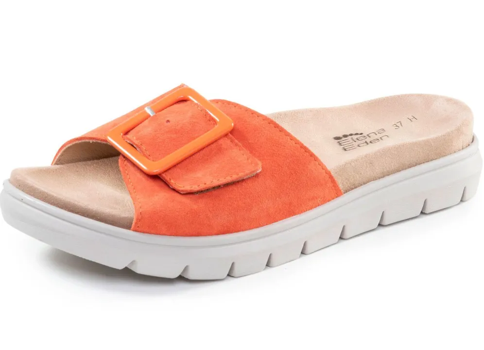 Pantoletten von ELENA EDEN aus Nubuk- oder Veloursleder: Weite H, verstellbare Klettspange mit Zierschließe, seitlicher Gummizug, Futter, herausnehmbares Fußbett sowie TR-Profilsohle mit flachem Keil