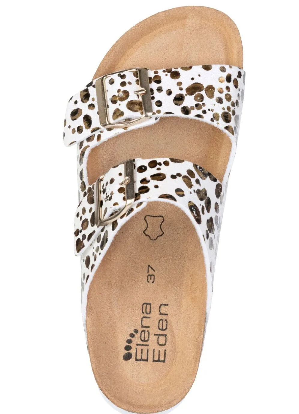 Trendige Pantoletten von ELENA EDEN, aus kaschiertem Synthetikmaterial mit schimmerndem Druck in Creme-Bronze: Weite H, zwei verstellbare Spangen, gepolstertes Lederfußbett sowie leichte 30 mm EVA-Plateau-Profilsohle mit flachem Absatz