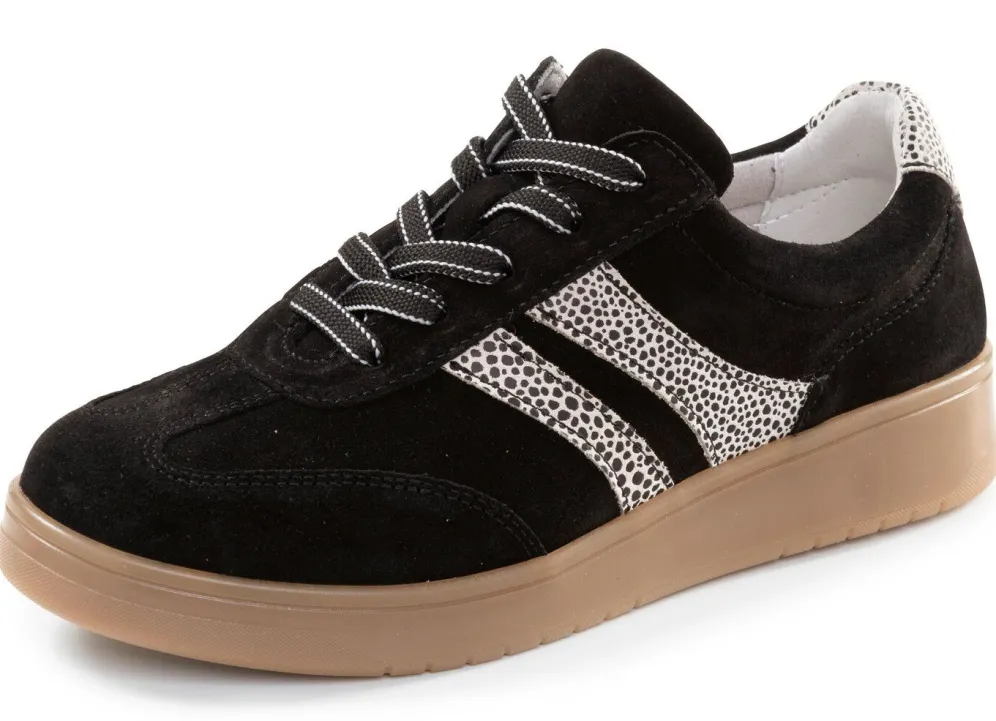 Trendige Sneaker von ELENA EDEN aus Veloursleder mit effektvoll geprägten Besätzen: Weite K, Schnürung und Seitenreißverschluss, Textilfutter, herausnehmbares Lederfußbett sowie TR-Riffelsohle mit 10 mm Keil