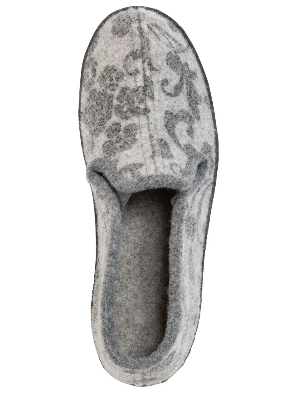 Floral bedruckter Wollfilz-Hausschuh in Grau: seitlich eingesetzte Gummizüge, Wollfilz-Fußbett mit Fersenluftpolster, Filzschalensohle, TR-Laufsohle sowie 25 mm Keilabsatz