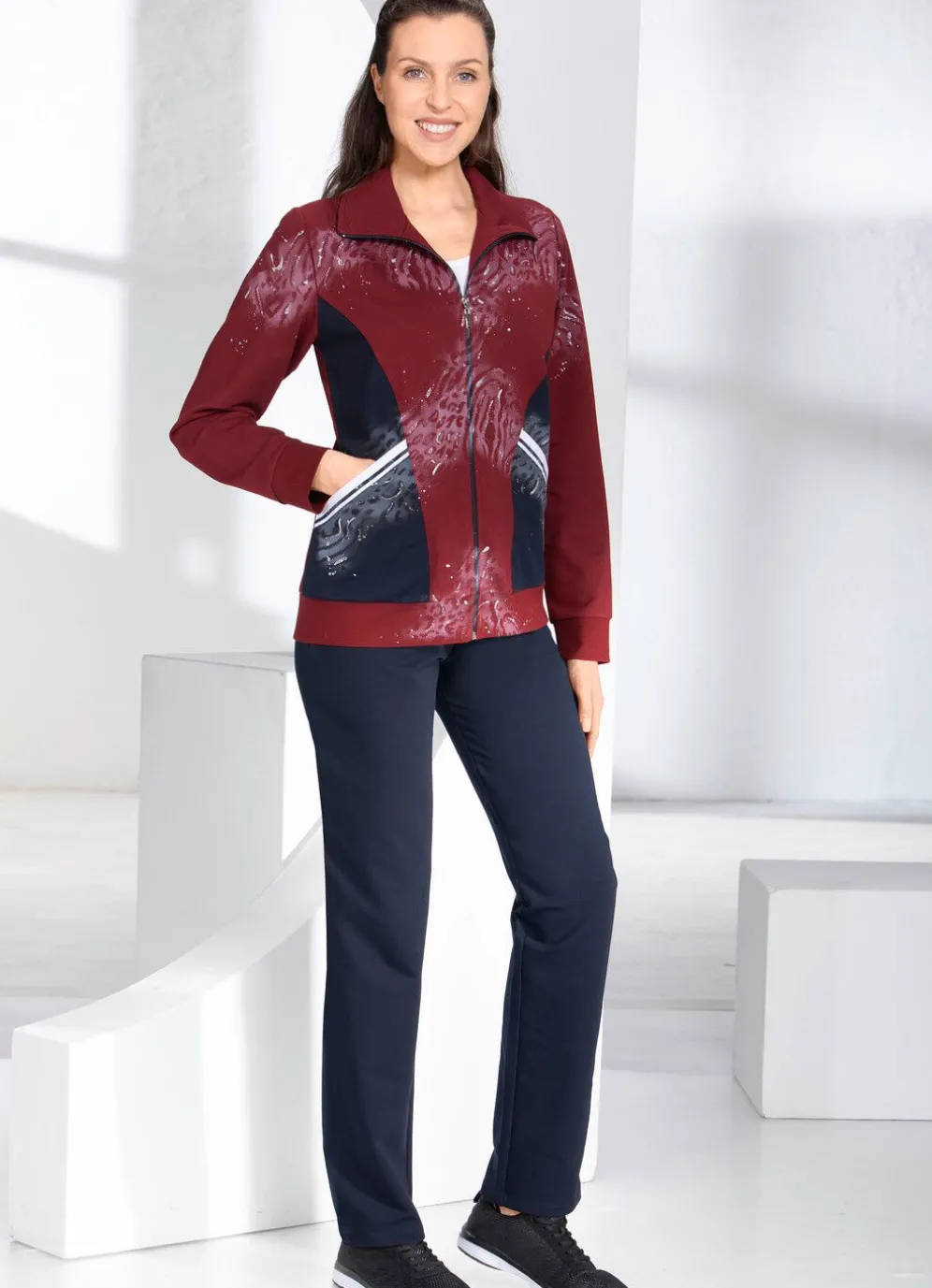 Attraktiver Freizeitanzug in Bordeaux-Marine! Oberteil mit Umlegekragen, Reißverschluss, zwei aufgesetzten Taschen mit Strickbesatz, elastischen Ärmelabschlüssen, elastischer Saumabschluss sowie Applikationen und Kontrasteinsatz im Vorderteil. Hose mit Durchzugsband und Stopper im Dehnbund sowie zwei Seitentaschen.
