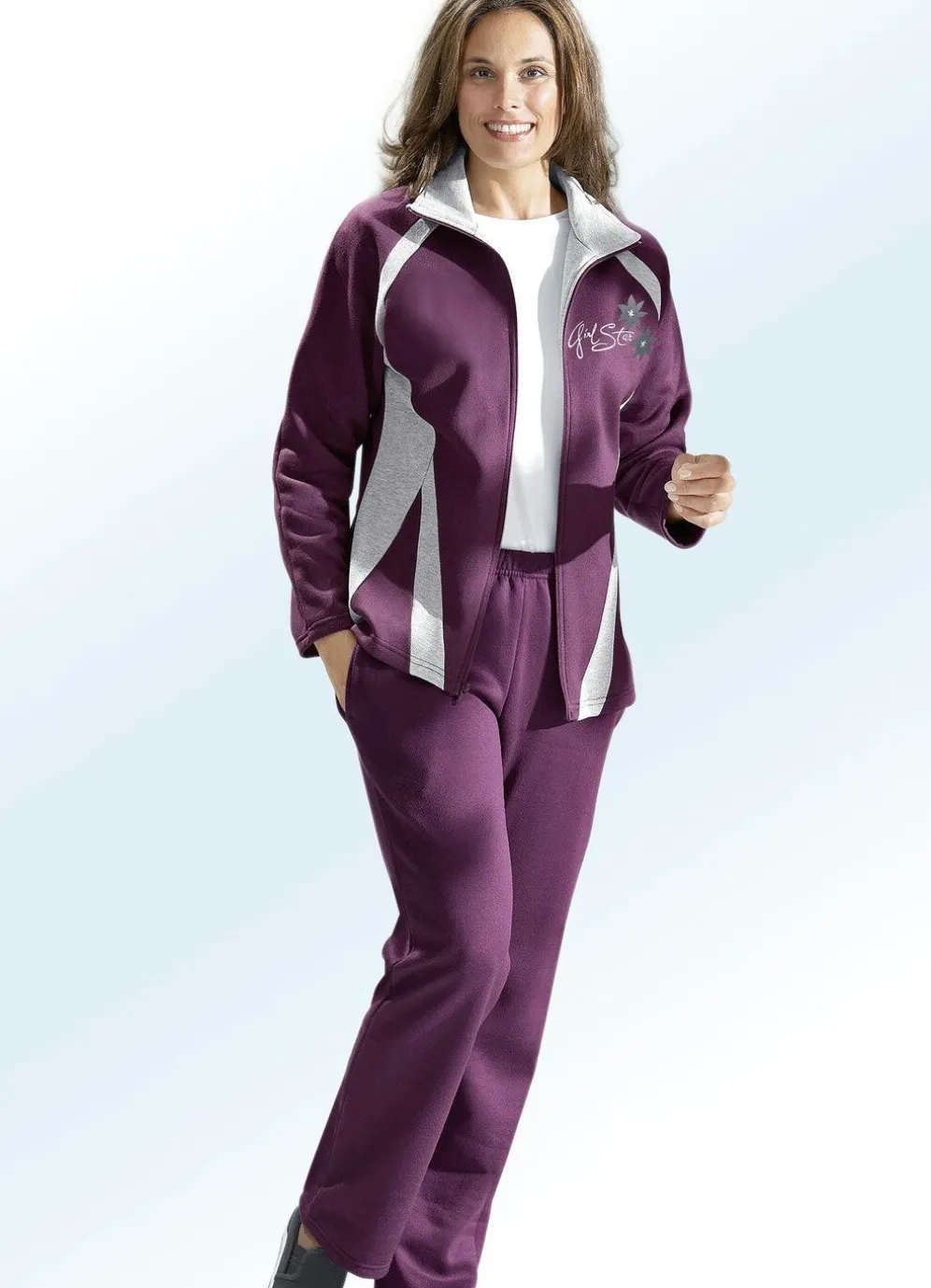 Exquisiter, aubergine-hellgrau melierter Freizeitanzug: Das in gerader Form geschnittene Oberteil ist mit durchgehendem Reißverschluss, Druck und Kontrast-Verarbeitung im Vorderteil sowie zwei Seitentaschen gearbeitet. Dazu gehört die Hose mit Kordelzug im Dehnbund, zwei Seitentaschen sowie geraden Beinabschlüssen.