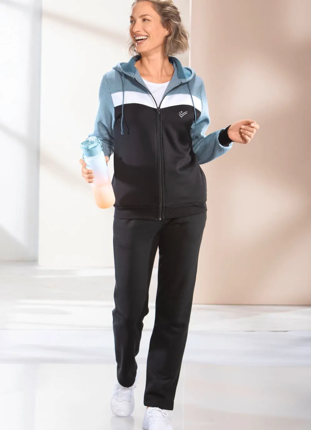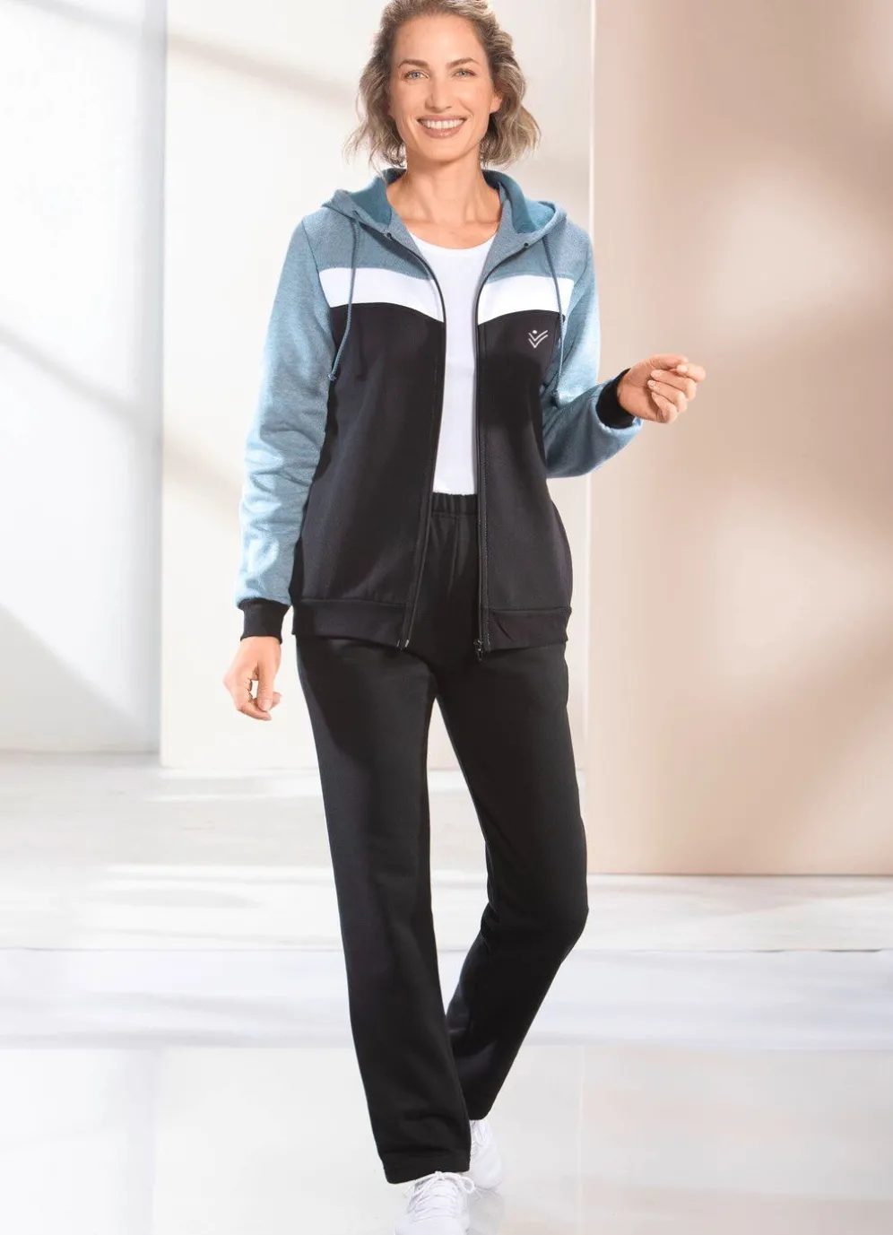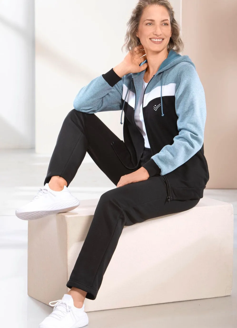 Legerer Freizeitanzug in Schwarz-Jeansblau meliert, mit Durchzugsband an der angeschnittenen Kapuze, Stickerei im Vorderteil links, Seitentaschen sowie elastischem Bund und Ärmelabschlüssen. Hose mit Kordelzug im Dehnbund, Seitentaschen und geraden Beinabschlüssen.