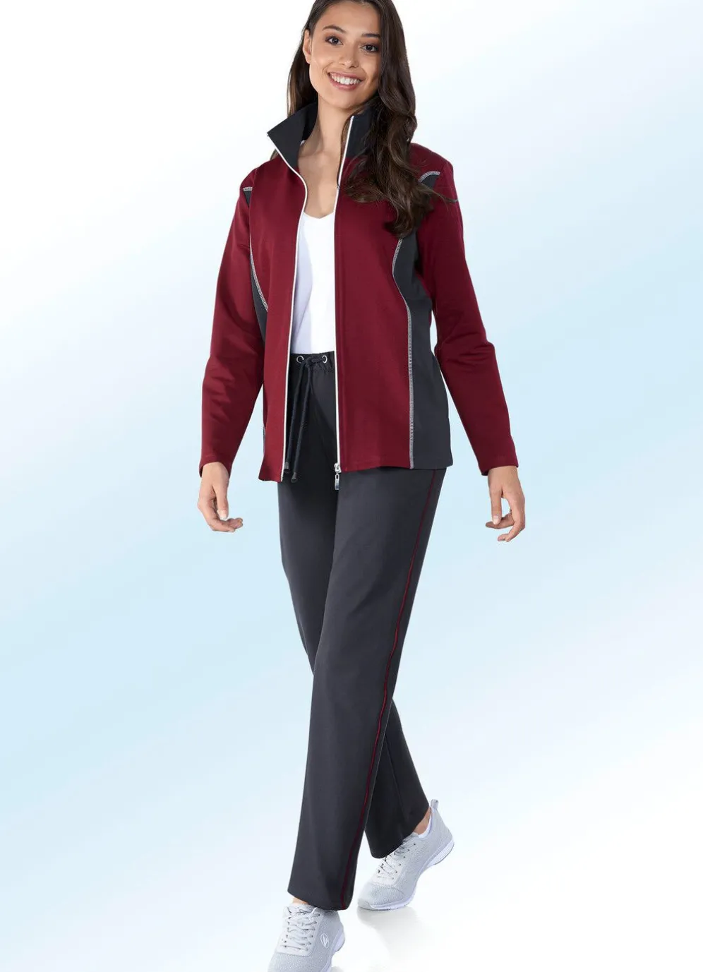 Freizeitanzug in Bordeaux-Marine: Oberteil in gerade geschnittener Form mit durchgehendem Reißverschluss, Kontrasteinsatz am Kragen und im Vorderteil, Seitentaschen. Hose mit Kordelzug im Dehnbund, Seitentaschen, seitlicher Paspel, geraden Beinabschlüssen.