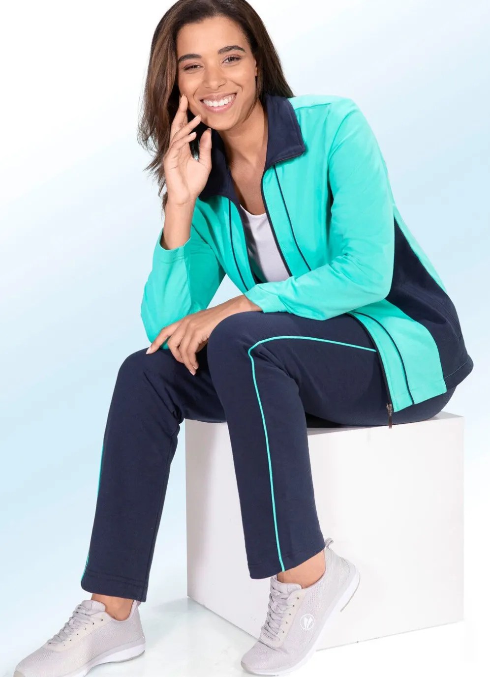 Freizeitanzug in Mint-Marine! Gerade geschnittenes Oberteil mit Reißverschluss und Seitentaschen. Hose mit Kordelzug im Dehnbund, Seitentaschen, geraden Beinabschlüssen sowie seitlicher Paspel.