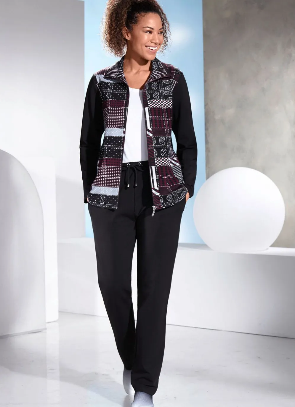 Gerade geschnittener Freizeitanzug in Schwarz- Beere. Oberteil mit Seitentaschen. Hose mit Durchzugsband und Stopper im Dehnbund sowie Seitentaschen.