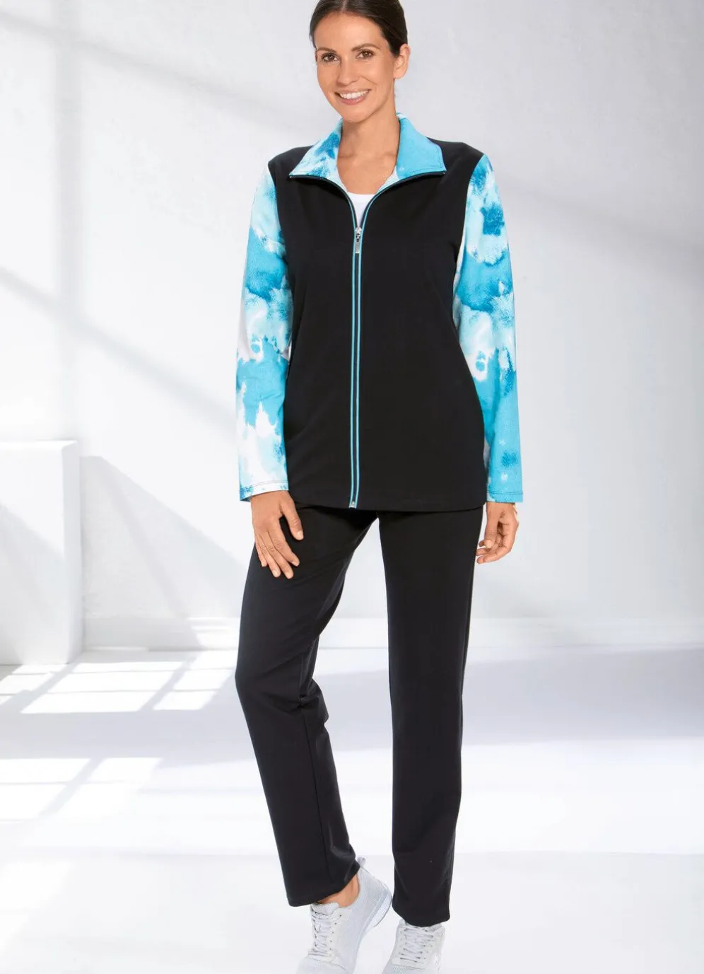 Toller, marine-türkisfarbener Freizeitanzug! Gerade geschnittenes Oberteil mit zwei Seitentaschen. Hose mit Kordelzug im Dehnbund sowie zwei Seitentaschen.