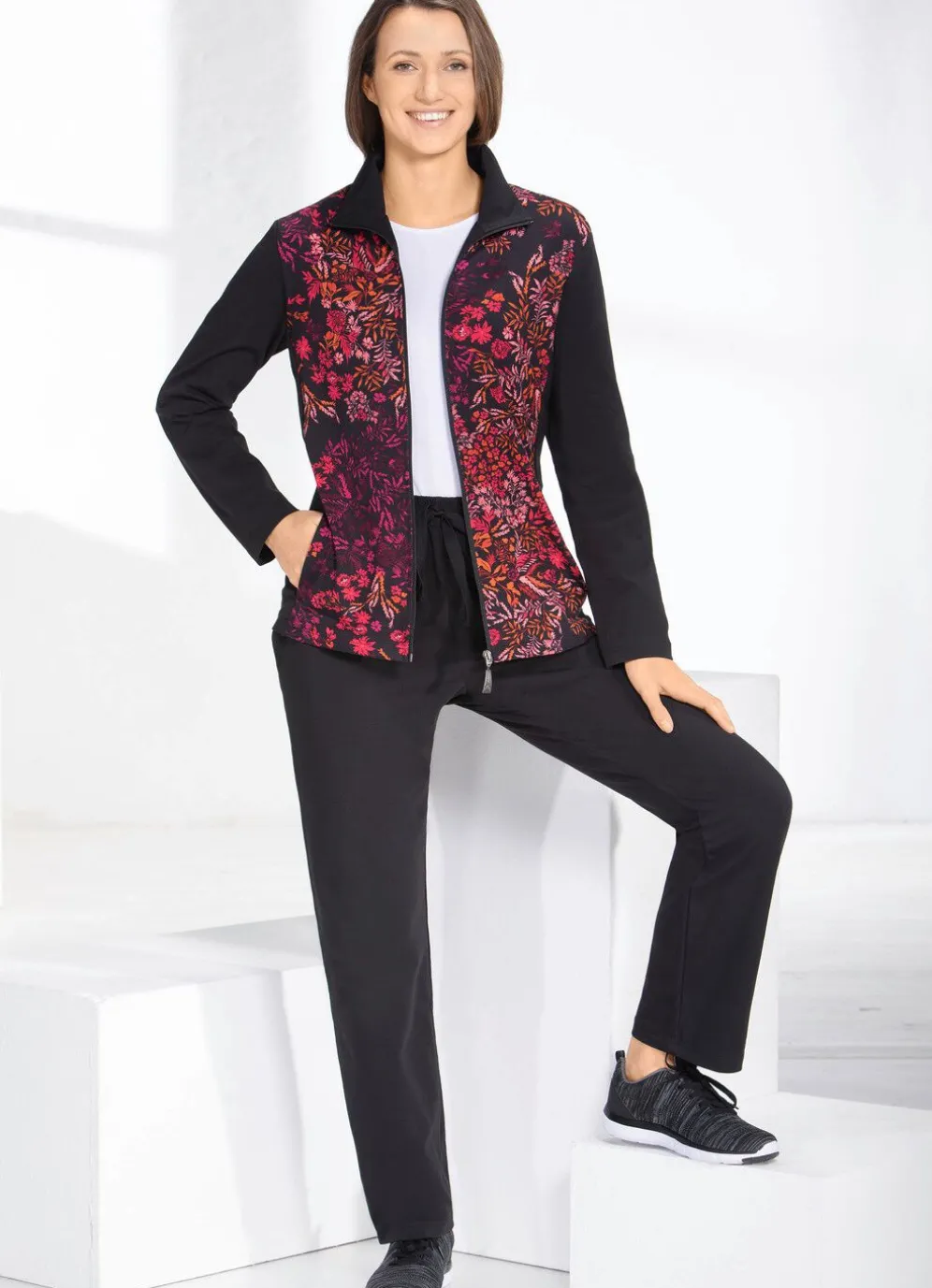Freizeitanzug von „Athlet” in Schwarz-Bunt. Gerade geschnittenes Oberteil mit Umlegekragen und zwei Seitentaschen. Hose mit Dehnbund, Durchzugsband sowie zwei Seitentaschen.