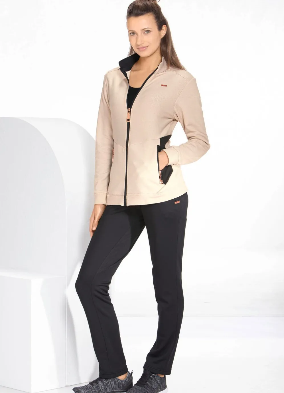 Lassen Sie sich diesen Freizeitanzug von „LPO“ in Beige-Anthrazit nicht entgehen! Mit Stehkragen, Reißverschluss, Seitentaschen mit Reißverschluss, elastischen Ärmelbündchen und Saumabschluss sowie Stickerei links. Hose mit Dehnbund und Seitentaschen, hautsympathische, und angeraute Innenseite.