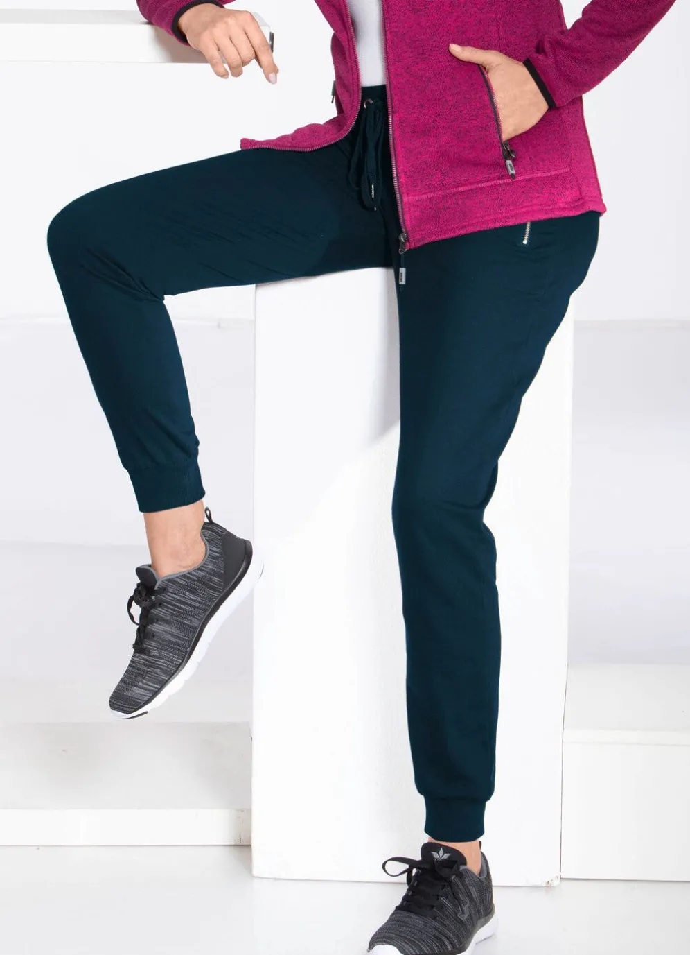 Sportive Freizeithose: Dehnbund mit Kordelzug, zwei Reißverschluss-Taschen sowie elastische Beinabschlüsse.