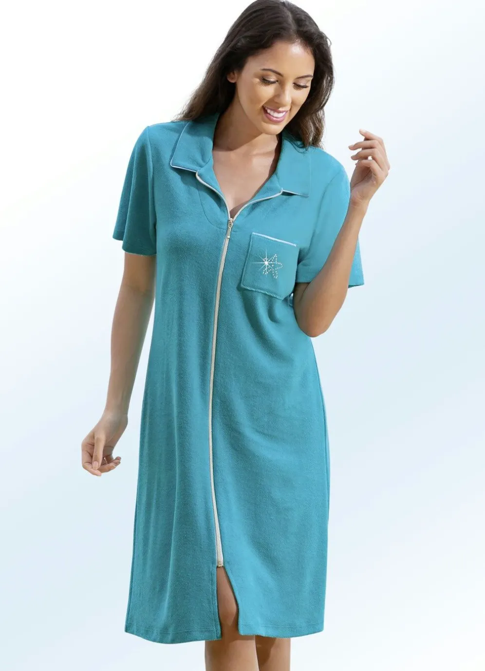 Lässiges, super bequemes Frottier-Kleid mit durchgehendem Reißverschluss, Strasssteinchenmotiv auf der aufgesetzten Tasche sowie kurzen Ärmeln. Länge ab 105 cm.