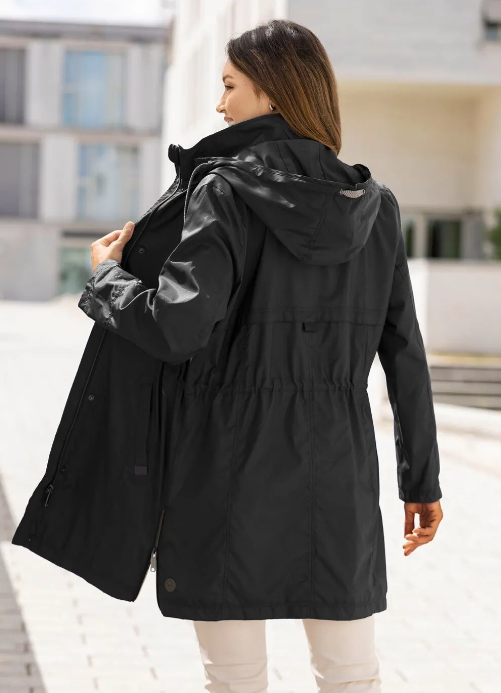 Funktions-Kurzmantel im Trench-Stil, mit Bindeband an der abnehmbaren Kapuze, durch Reißverschluss unter der Druckerleiste hoch schließbarem Stehkragen, Zierkoller im Vorder- und Rückteil, Durchzugsband und Stopper in der Taille, Blende an den Schubtaschen, Reißverschluss an den Seitenschlitzen sowie einer Innentasche. Länge ca. 89 cm, ab Gr. 44 ca. 91 cm, ab Gr. 52 ca. 93 cm.