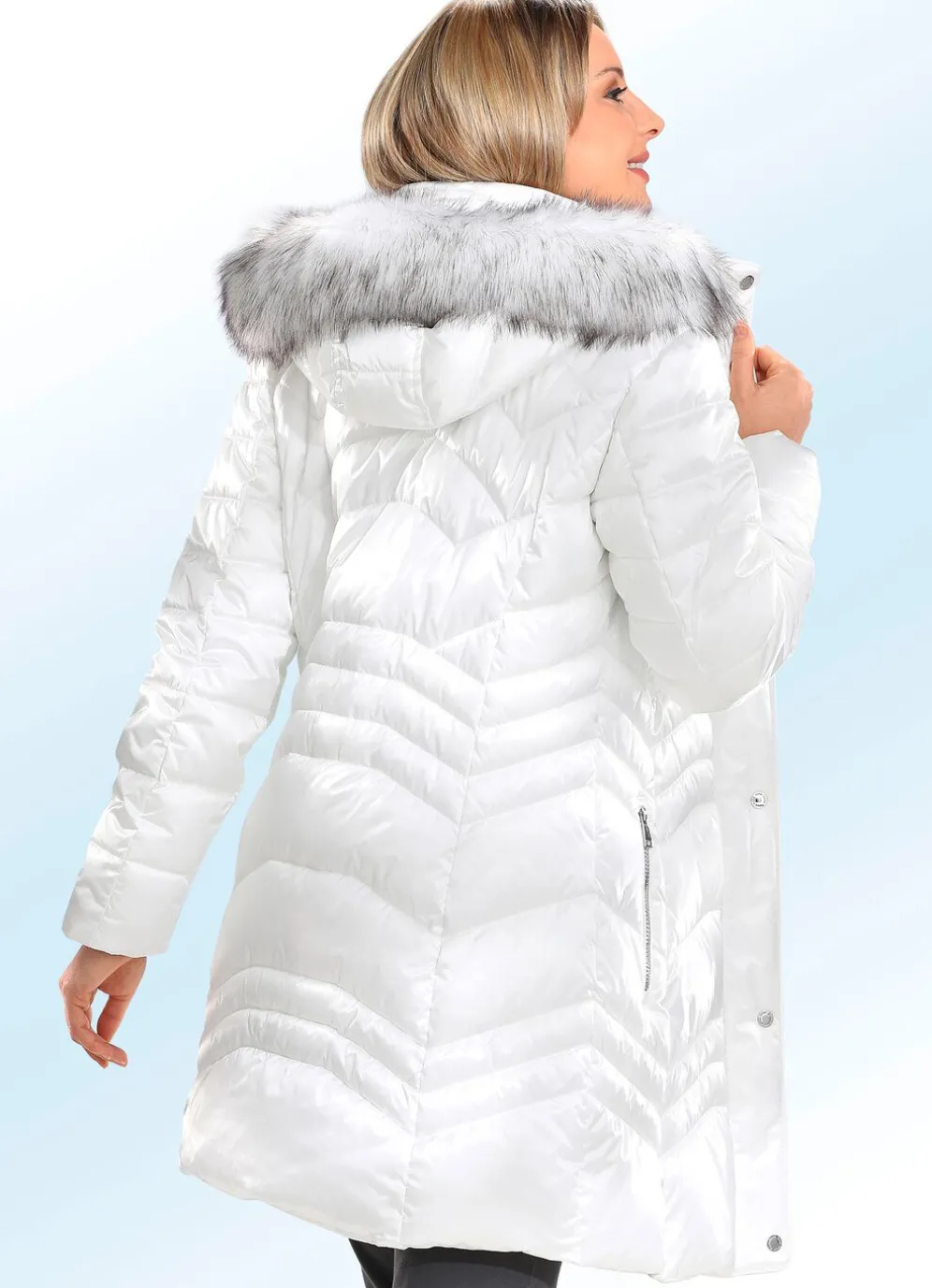 Mit modischem Chic zeigt sich dieser traumhafte Funktions-Kurzmantel: abnehmbare Kapuze mit Durchzugsband, Stopper und abnehmbarem Kunstpelz-Besatz, durch 2-Wege-Reißverschluss unter der Druckerleiste hoch schließbarer Stehkragen, Reißverschlusstaschen sowie eine Innentasche. Länge ca. 88 cm.