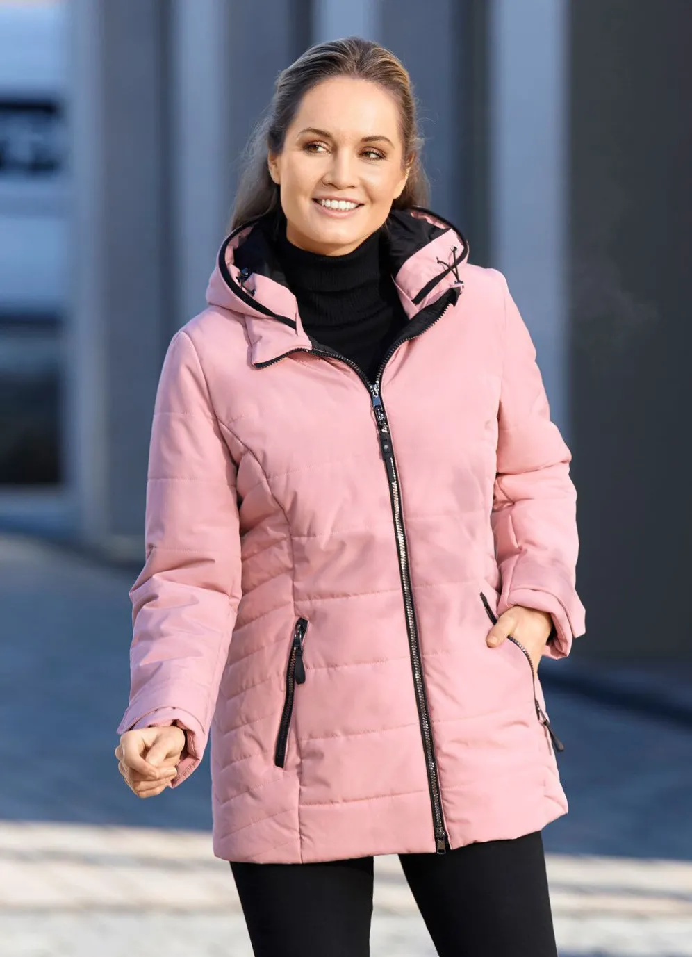 Sichern Sie sich ein absolutes Trendstück mit dieser roséfarbenen Funktionsjacke: abnehmbare Kapuze mit Durchzugsband und Stopper, durch 2-Wege-Reißverschluss hoch schließbarer Stehkragen, Taschen mit Reißverschluss, durch Riegel mit Klett weitenregulierbare Ärmelabschlüsse, eine Innentasche sowie leicht verlängertes Rückteil. Länge ca. 74 cm, ab Gr. 42 ca. 76 cm, ab Gr. 48 ca. 78 cm.